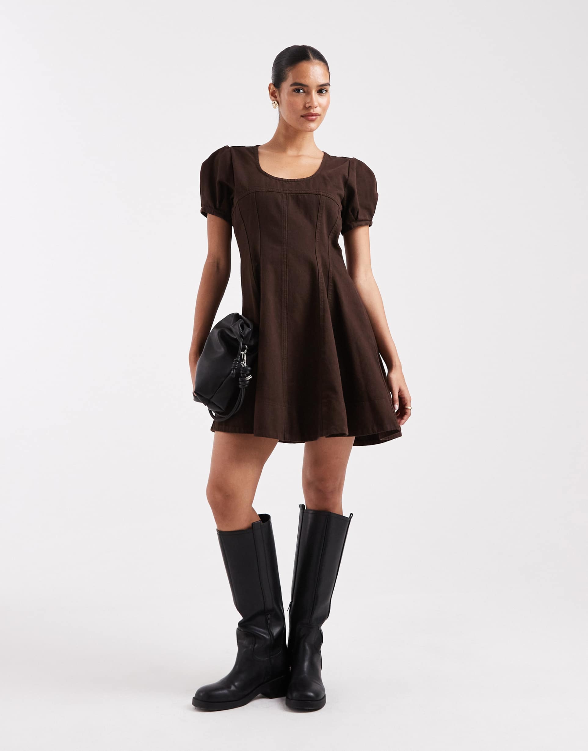 ASOS DESIGN DENIM SEAMED MINI DRESS IN CHOCOLATE