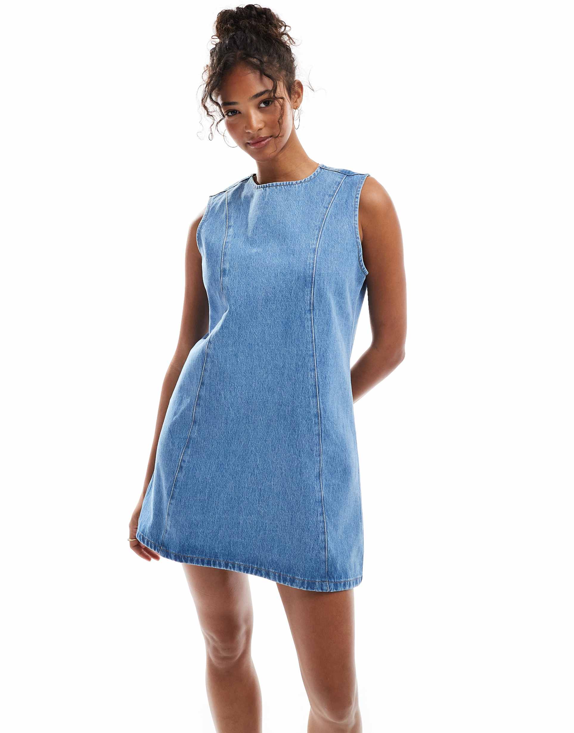 ASOS DESIGN DENIM SEAMED SHIFT DRESS IN MID BLUE