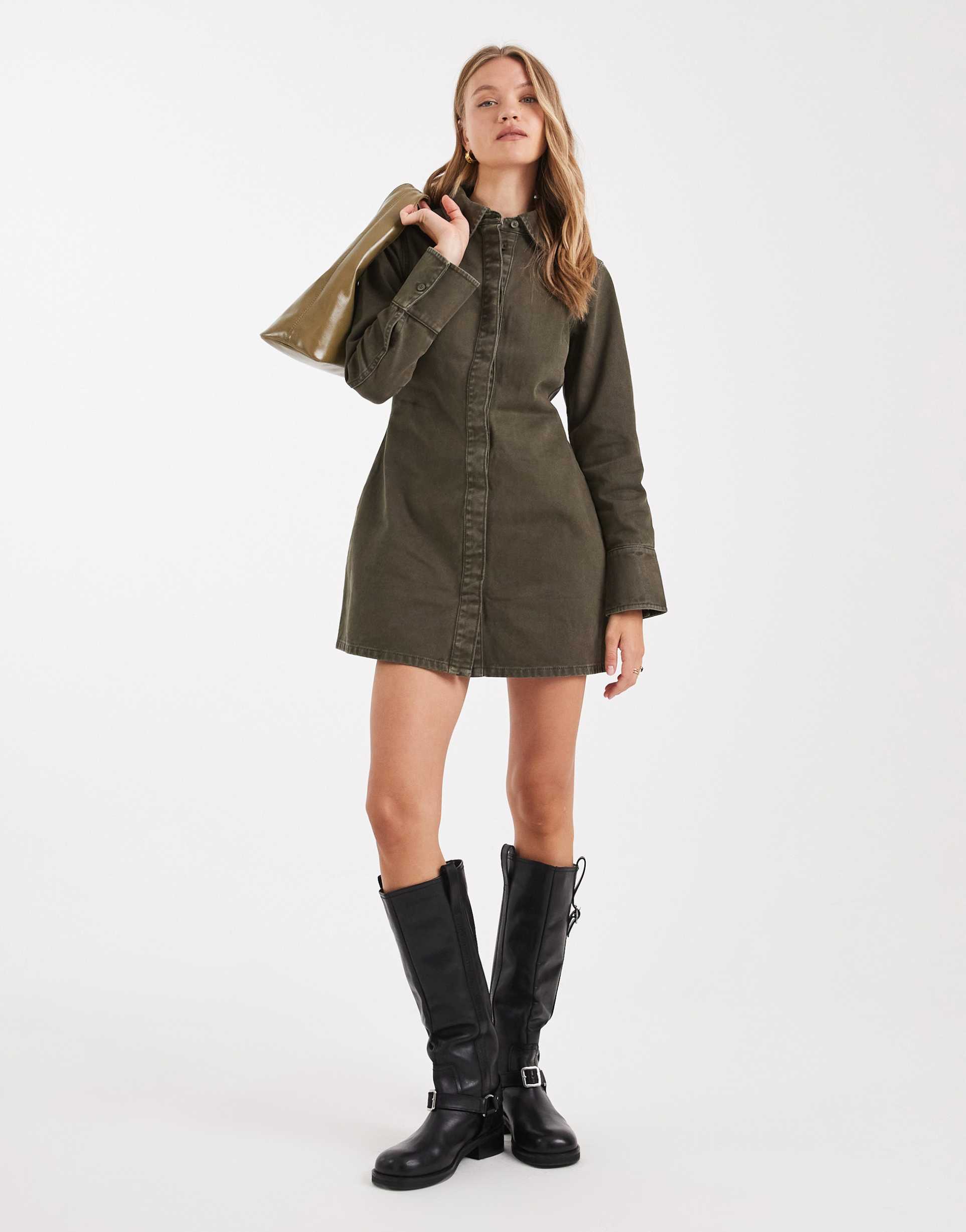 ASOS DESIGN DENIM SHIRT DRESS WITH CINCH BACK DETAIL IN KHAKI GREEN