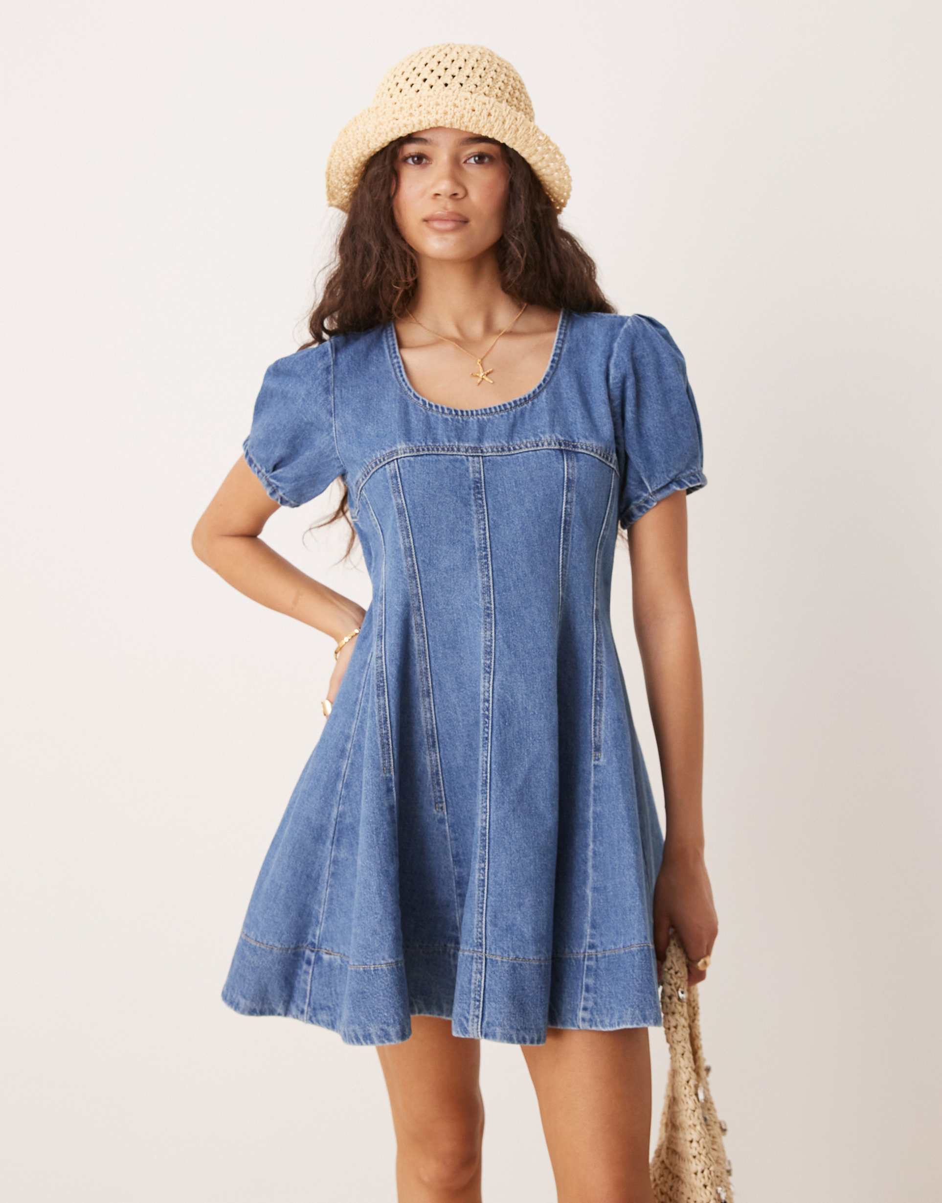 ASOS DESIGN DENIM SHORT SLEEVE MINI DRESS WITH SEAMED DETAIL IN MID-WASH BLUE