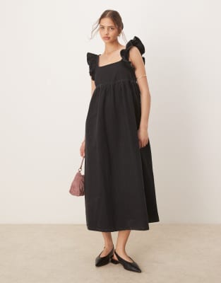 ASOS DESIGN DENIM SMOCK MAXI DRESS WITH BOW BACK IN BLACK