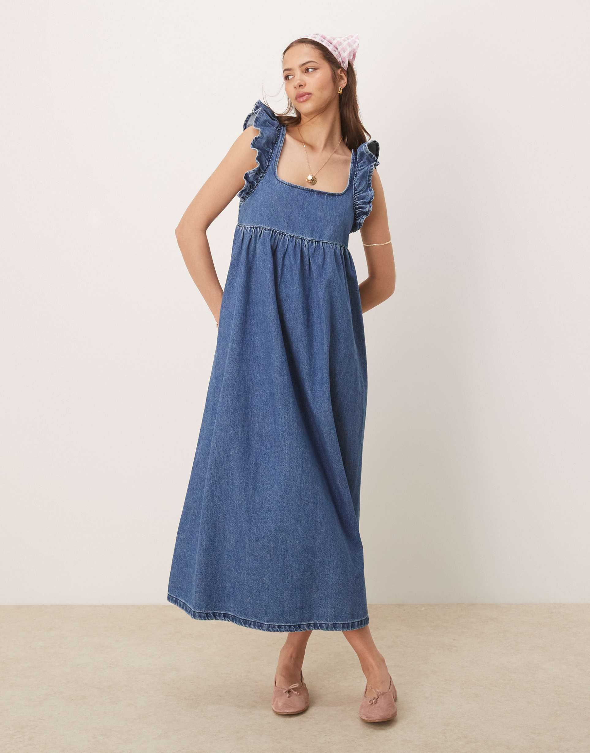 Soft midwash denim crafted from pure cotton creates a relaxed maxi smock silhouette with a flattering regular fit. The square neckline and sleeveless design with ruffled wide straps add a playful feminine touch, complemented by a charming tie-back closure that enhances the casual chic vibe. Perfectly suited for casual outings, everyday wear, and sunlit brunches, this dress combines comfort with breezy style for spring and summer days. The clean hemline and subtle ruffle details on the shoulders keep the look fresh and effortless.