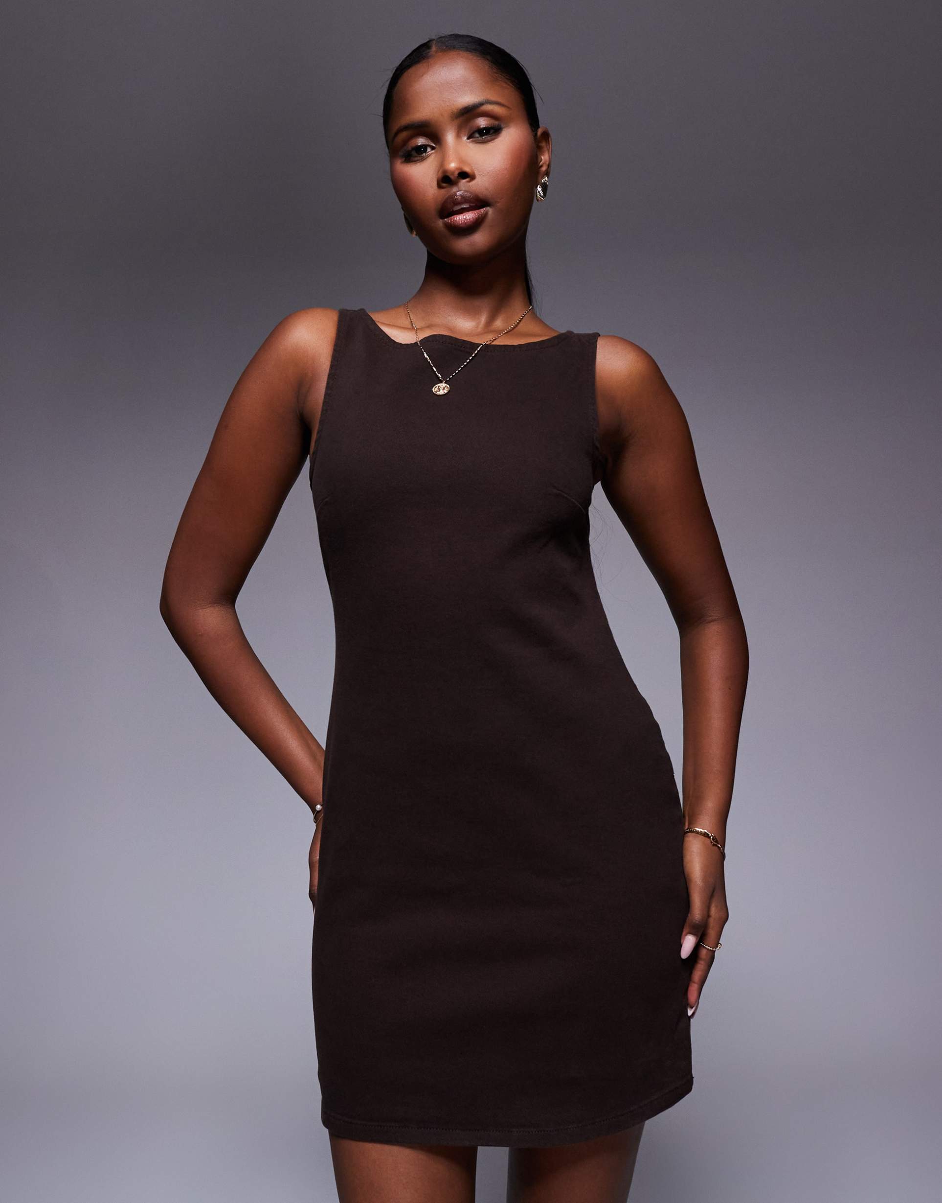 Matte brown denim fabric shapes a sleek sheath silhouette with a flattering mini length and regular fit. The sleeveless design and boat neckline offer a minimalist, casual chic vibe, while seam details add subtle visual interest along the front and back. A back zipper closure ensures easy wear. This versatile cotton denim dress is perfect for casual outings, streetwear looks, or date nights, making it an essential piece for all-weather style.