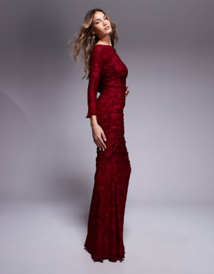 ASOS DESIGN DEVORE LONG SLEEVE RUCHED MAXI DRESS IN WINE