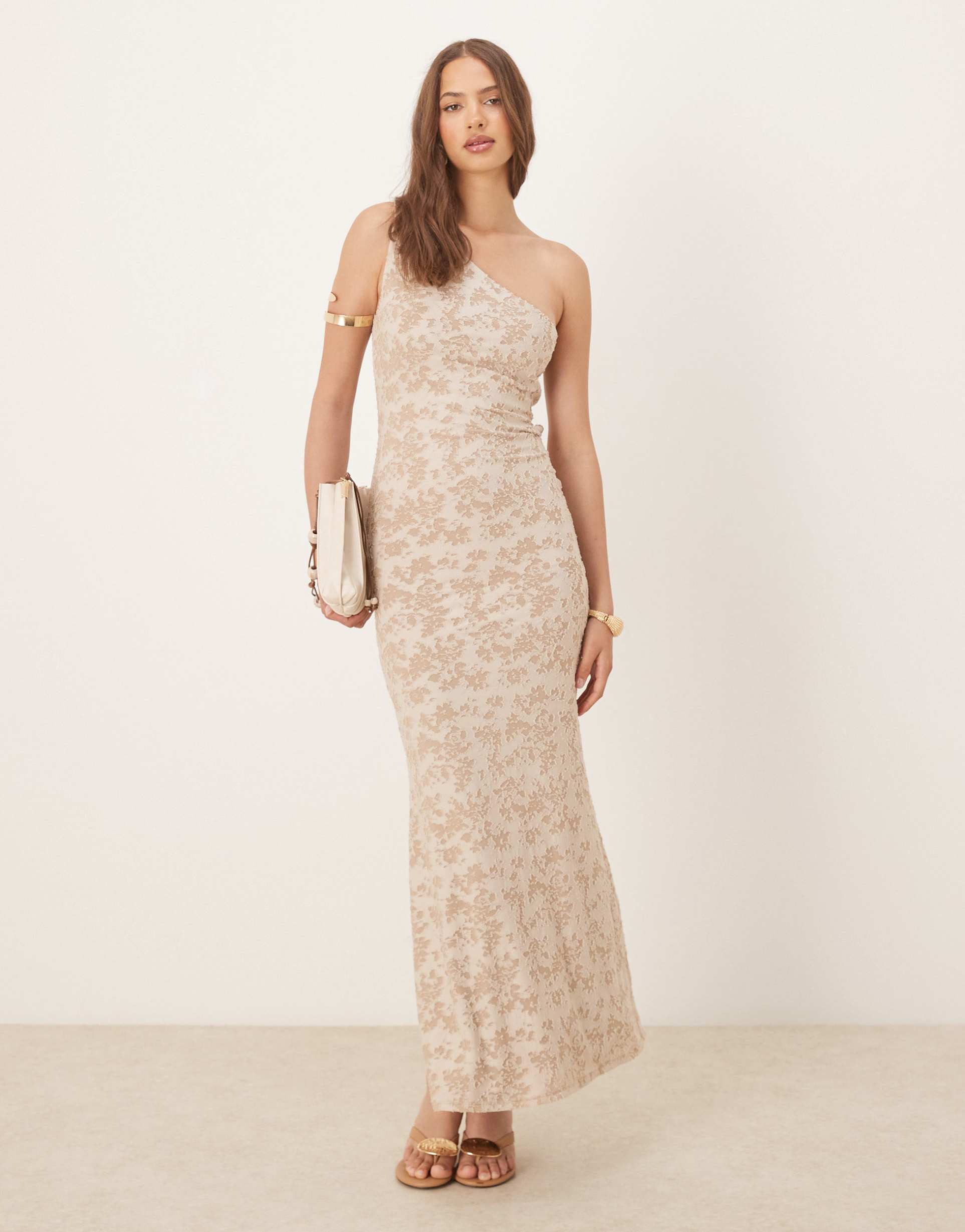ASOS DESIGN DEVORE ONE SHOULDER MAXI DRESS WITH TIE BACK DETAIL IN STONE