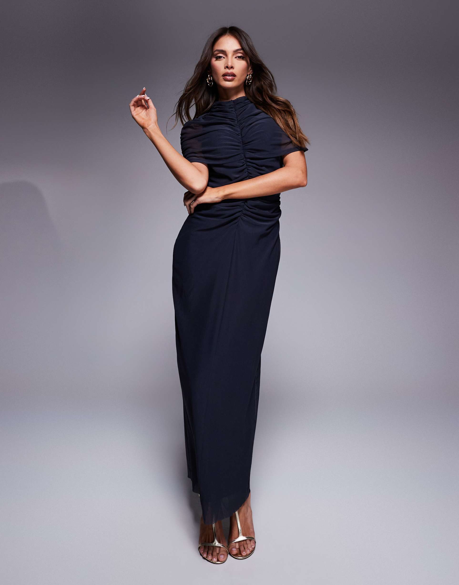 ASOS DESIGN DOUBLE LAYER MESH HIGH NECK MAXI DRESS WITH SHEER PANEL IN NAVY