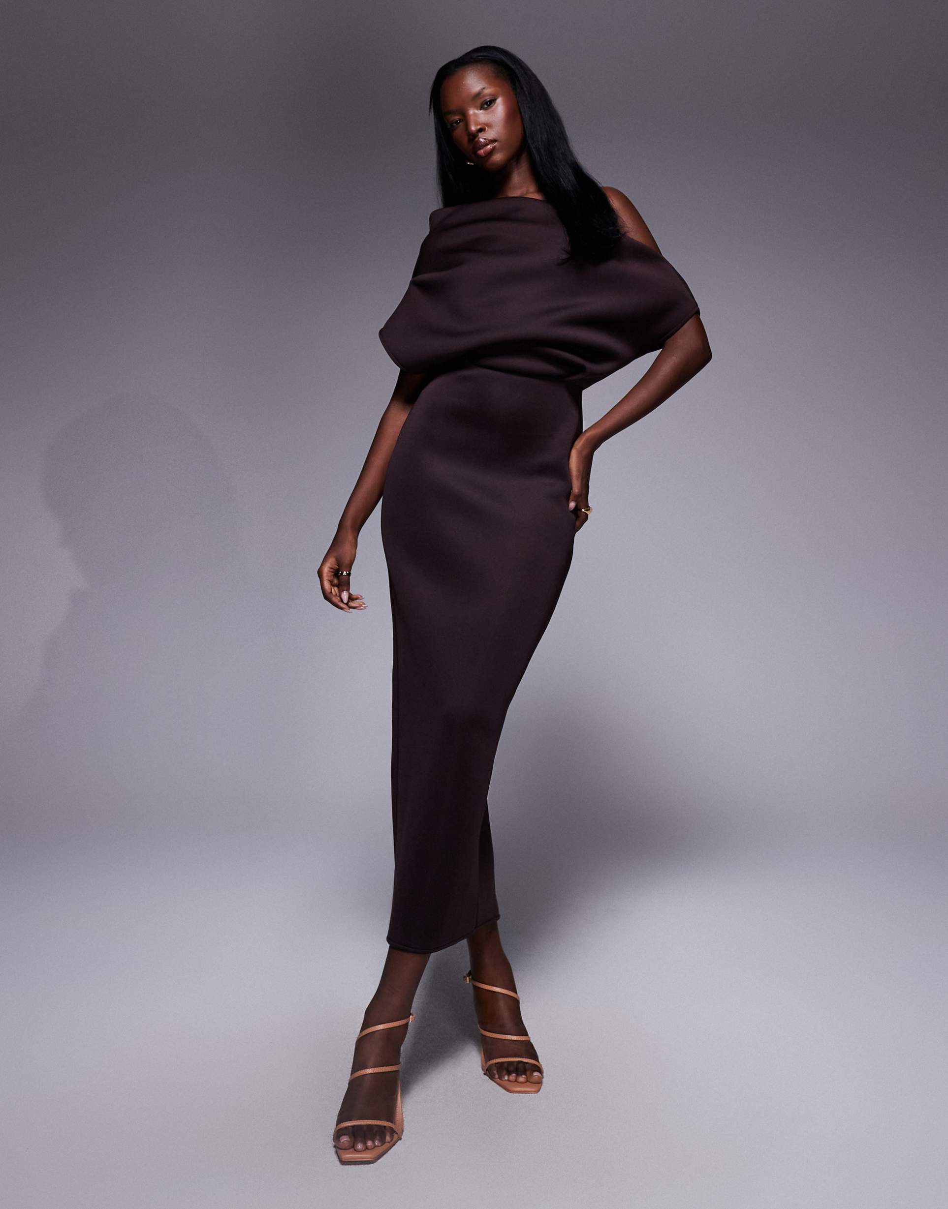 ASOS DESIGN DRAMATIC NECKLINE MIDI DRESS IN CHOCOLATE IN SCUBA-STYLE FABRIC