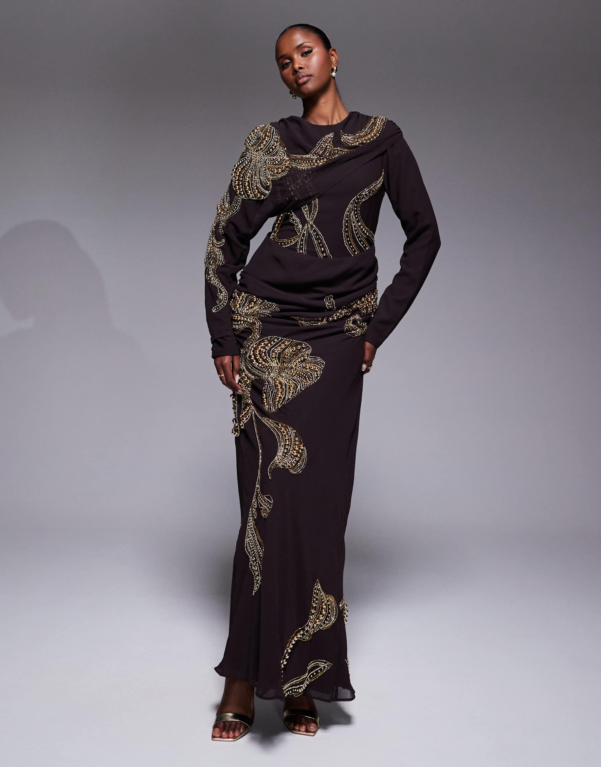ASOS DESIGN DRAPE SHOULDER EMBELLISHED PLEATED MAXI DRESS IN CHOCOLATE