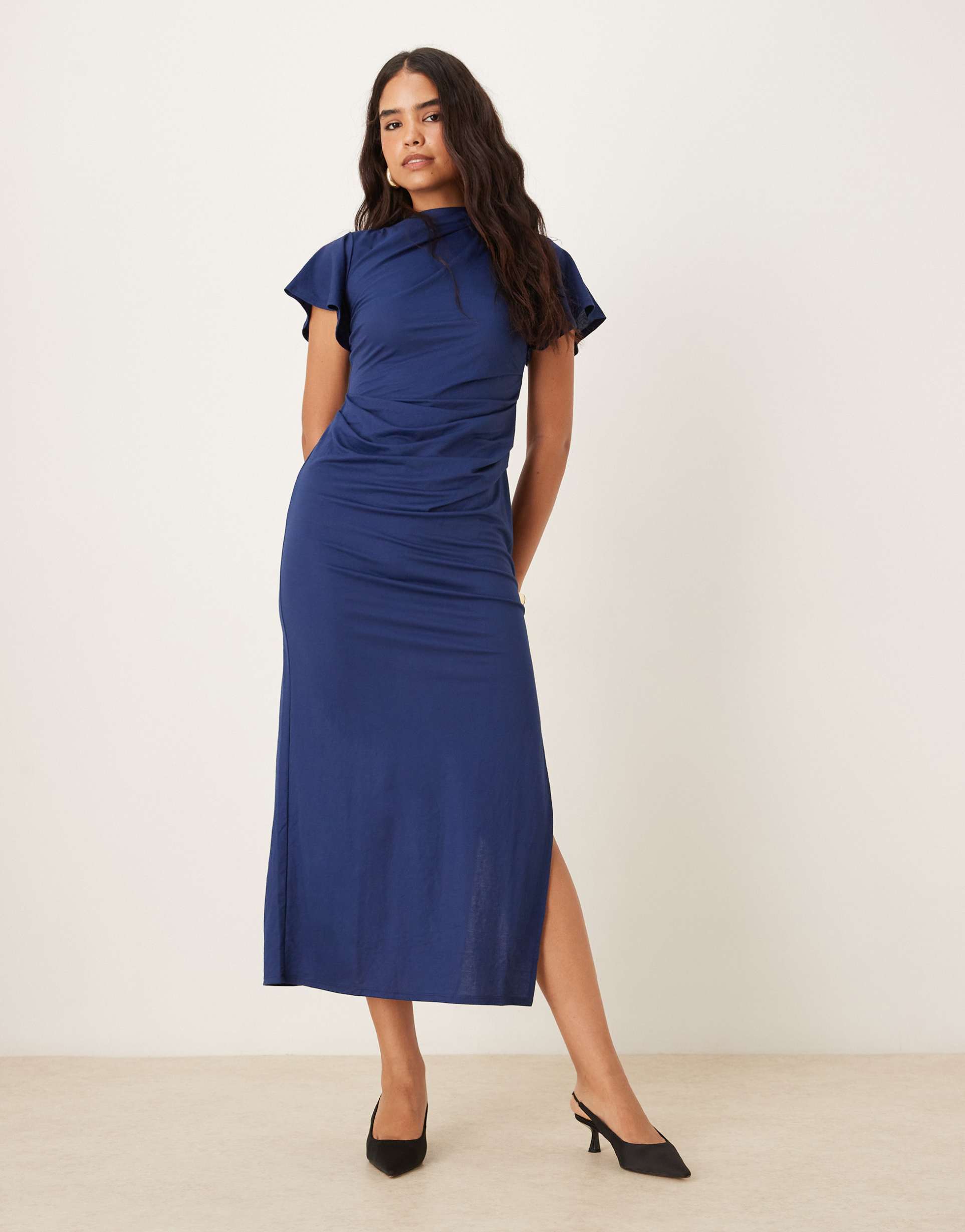 ASOS DESIGN DRAPED ANGEL SLEEVE MAXI DRESS IN NAVY