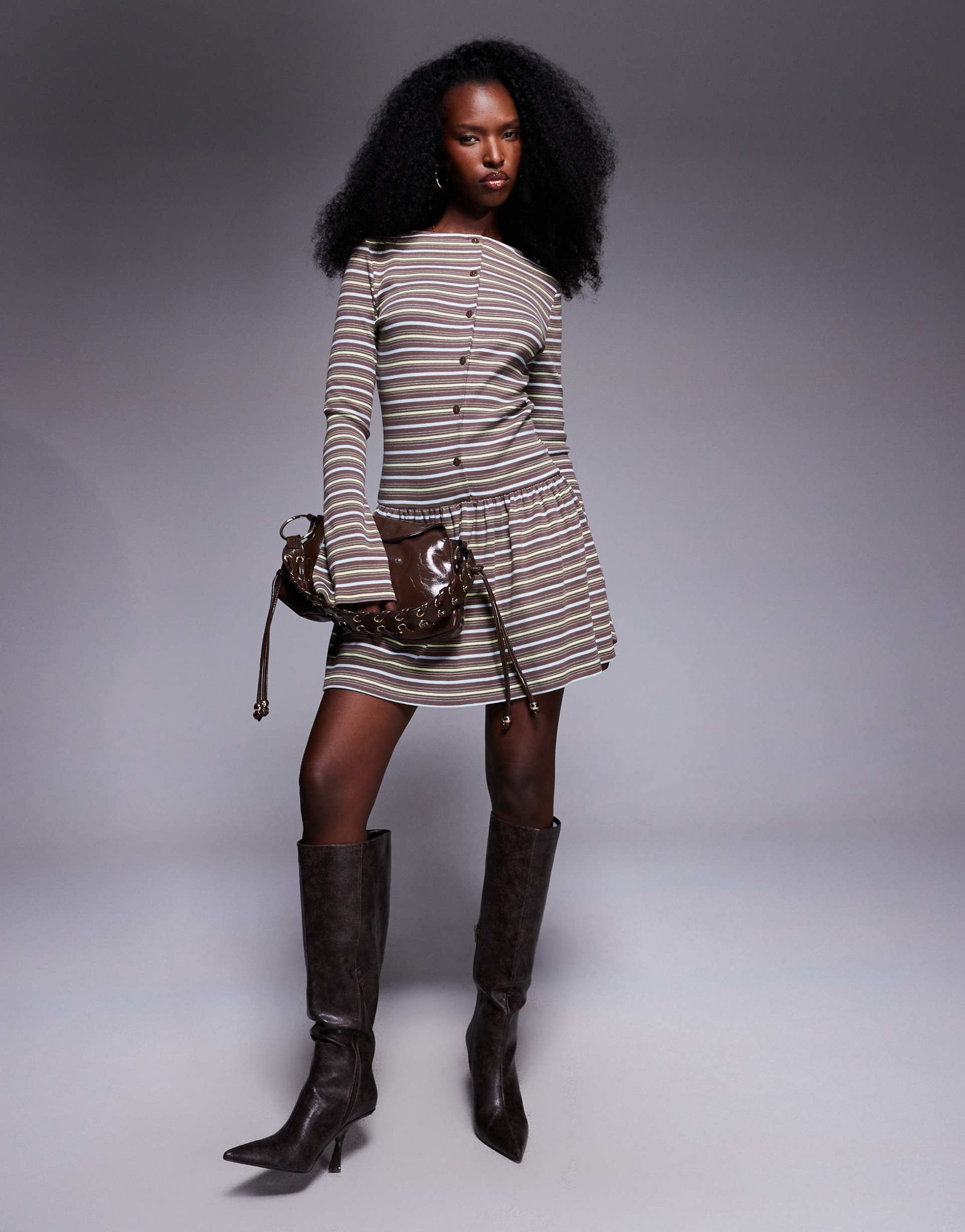 ASOS DESIGN DROPPED WAIST BUTTON THROUGH DRESS IN BROWN STRIPE