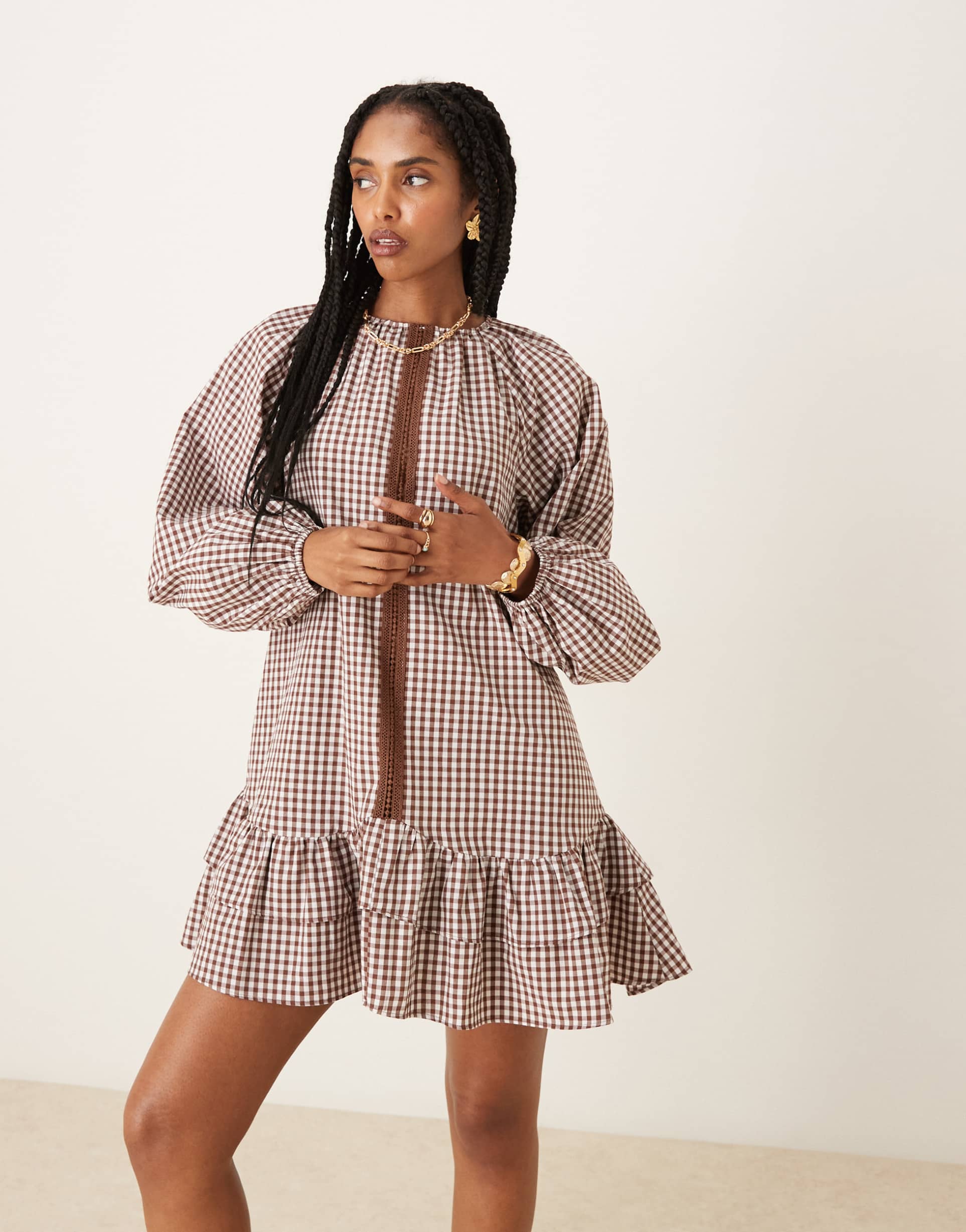 ASOS DESIGN DROPPED WAIST FRILL DETAIL MINI DRESS WITH LACE TRIM IN BROWN GINGHAM
