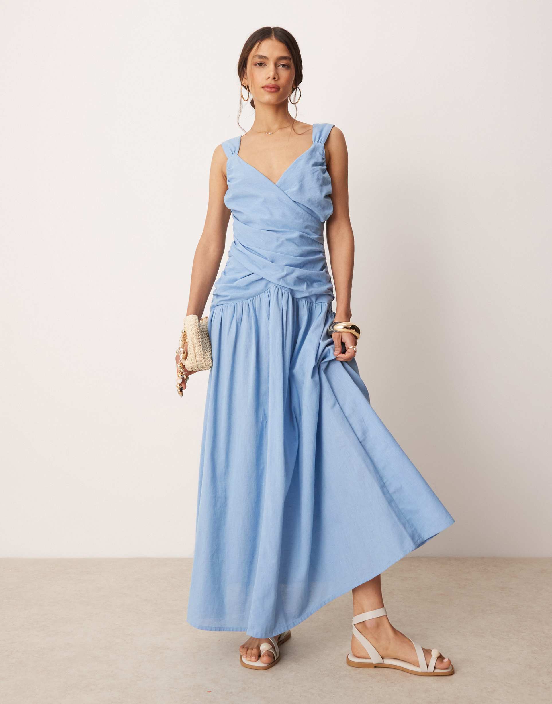 ASOS DESIGN DROPPED WAIST LINEN LOOK MIDAXI DRESS WITH WRAP BODICE IN SKY BLUE