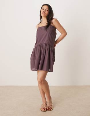 A lightweight cotton mini dress in a rich matte brown shade features a relaxed, regular fit with a dropped waist and a ruffled hemline for subtle movement. The square neckline and delicate tie straps offer a minimalist yet chic style perfect for warm spring and summer days. This versatile shift dress suits casual outings, brunch dates, and laid-back evenings, combining comfort with effortless style. Crafted from soft, breathable cotton with a matching lining, it ensures easy wear and a flattering silhouette for everyday sophistication.