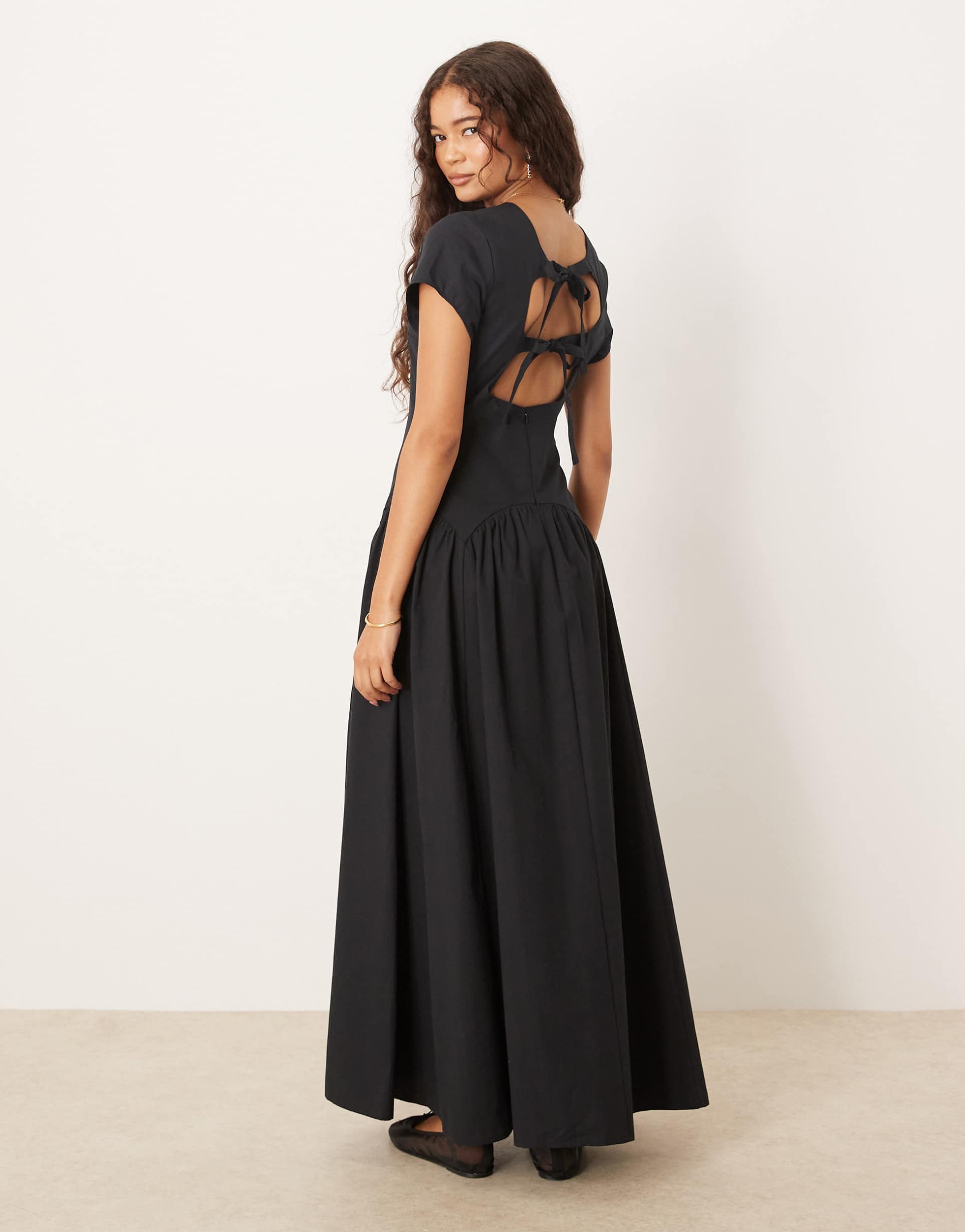 This matte black cotton maxi dress features a relaxed regular fit with a dropped waistline for subtle shape and a classic round neckline paired with half sleeves. The standout cut-out back with a tie-back fastening adds a modern twist to the minimalist, casual chic silhouette. Its clean hemline complements the effortless flow of the fabric, making it perfect for spring and summer occasions such as casual outings, brunch dates, and relaxed evening events. Lightweight and breathable, this dress combines comfort with understated style.