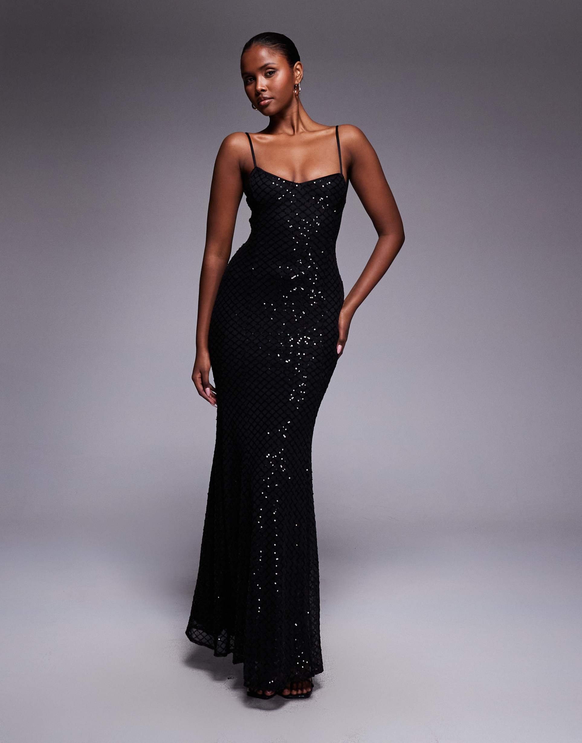 ASOS DESIGN EMBELLISHED GRID SEQUIN LACE UP BACK MAXI DRESS IN BLACK