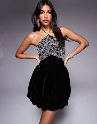 ASOS DESIGN EMBELLISHED VELVET HALTER MINI DRESS WITH BUBBLE HEM IN BLACK