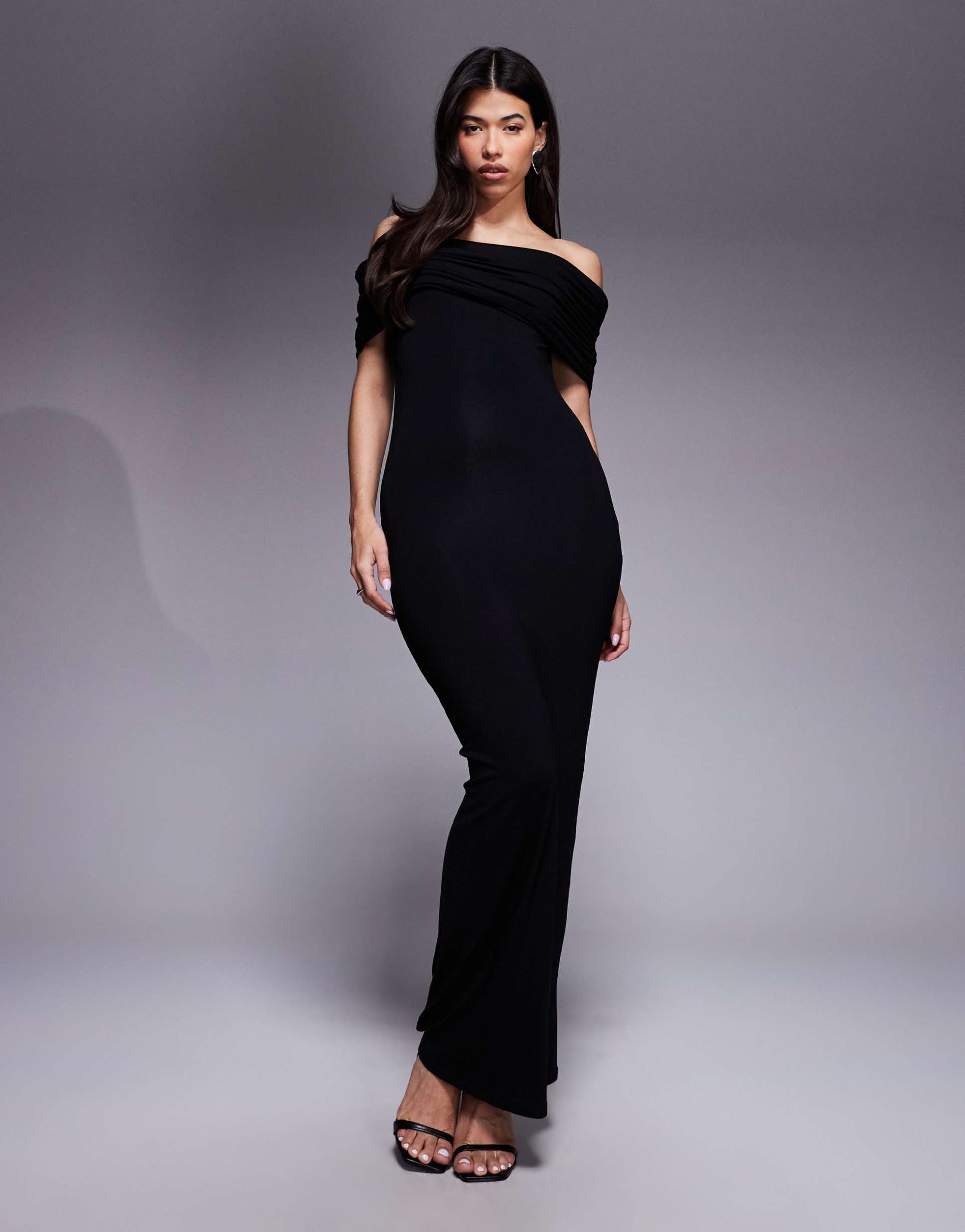 ASOS DESIGN EXTREME RUCHED OFF THE SHOULDER MIDI DRESS IN BLACK