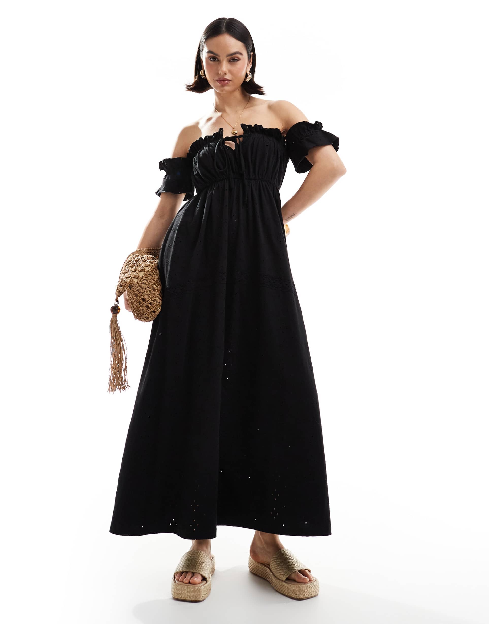 ASOS DESIGN EYELET FRILL OFF THE SHOULDER MIDAXI DRESS IN BLACK