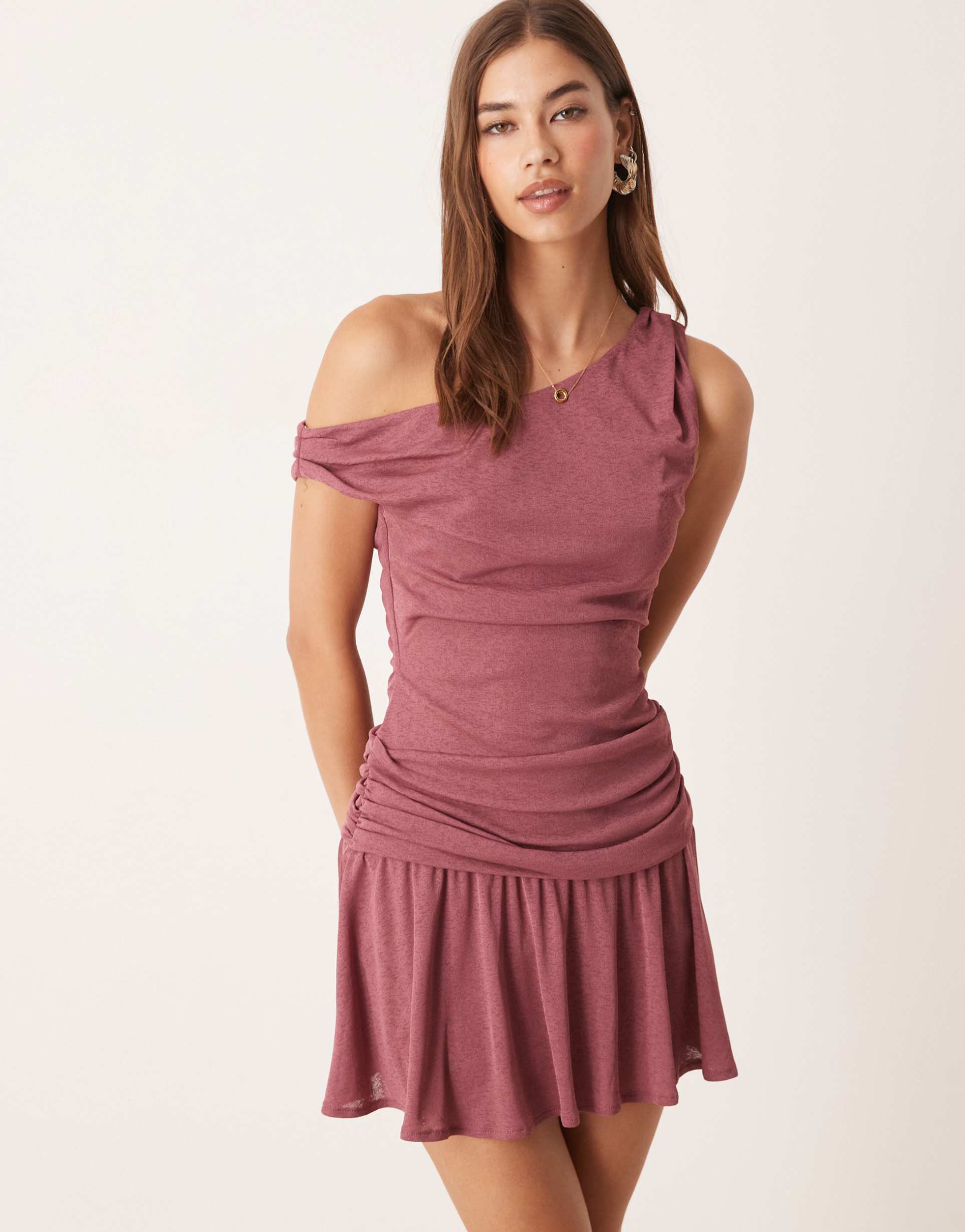 Soft, stretchy jersey fabric shapes this dusty rose mini dress with a relaxed fit and asymmetric cold-shoulder neckline. Ruched sides enhance the silhouette while a flared, pleated skirt adds playful movement to the hem. Ideal for spring and summer, this casual chic dress suits brunches, date nights, and casual outings. The subtle pleating detail on the skirt and ruching at the bodice bring stylish texture, making it a versatile choice for effortless everyday elegance.