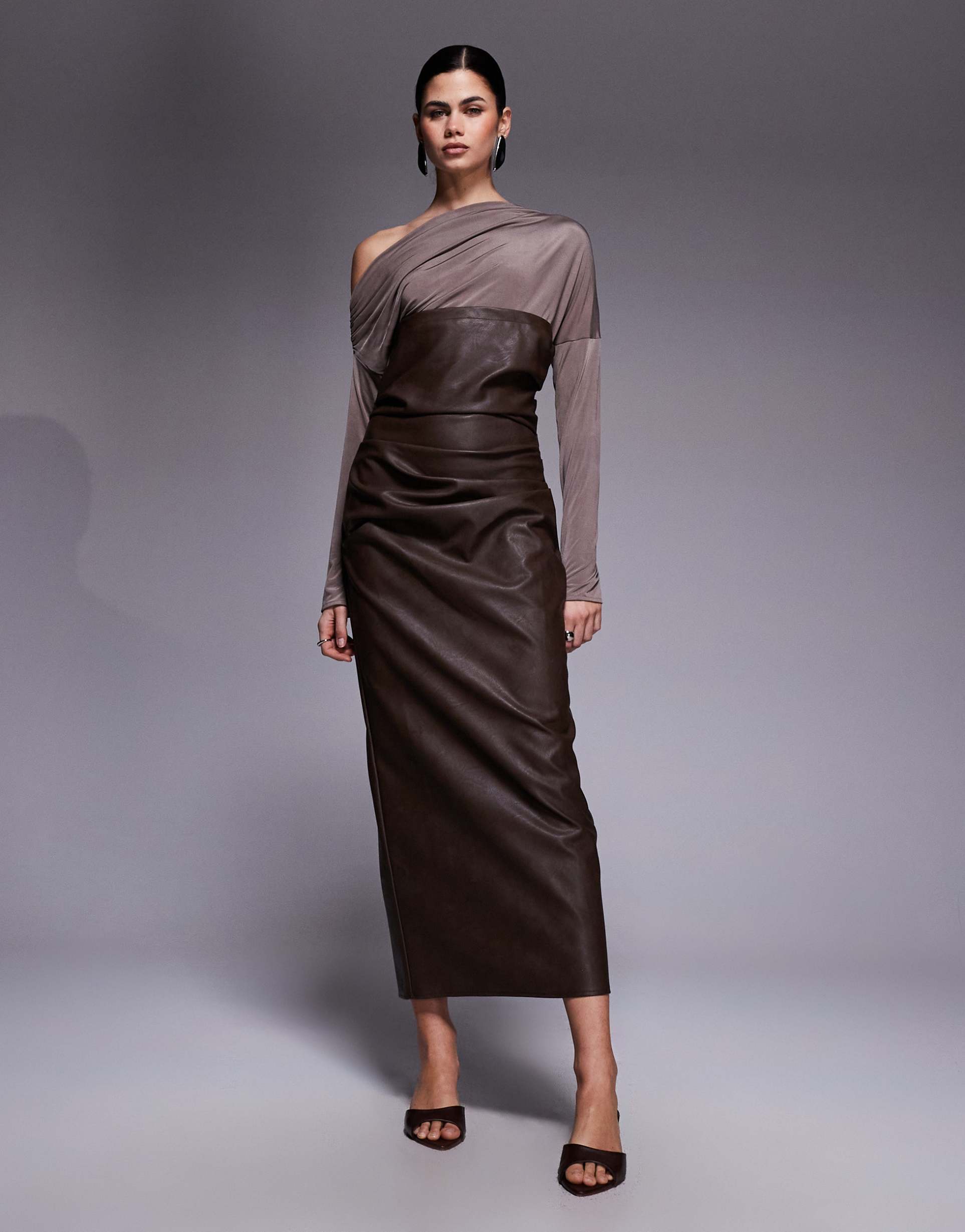 ASOS DESIGN FALLEN SHOULDER PU MIDI DRESS IN CHOCOLATE