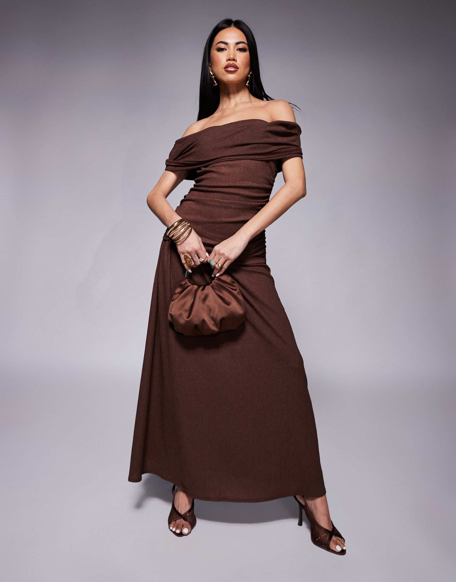 ASOS DESIGN FALLEN SHOULDER RUCHED ASYMMETRIC WAIST MIDAXI DRESS IN BROWN