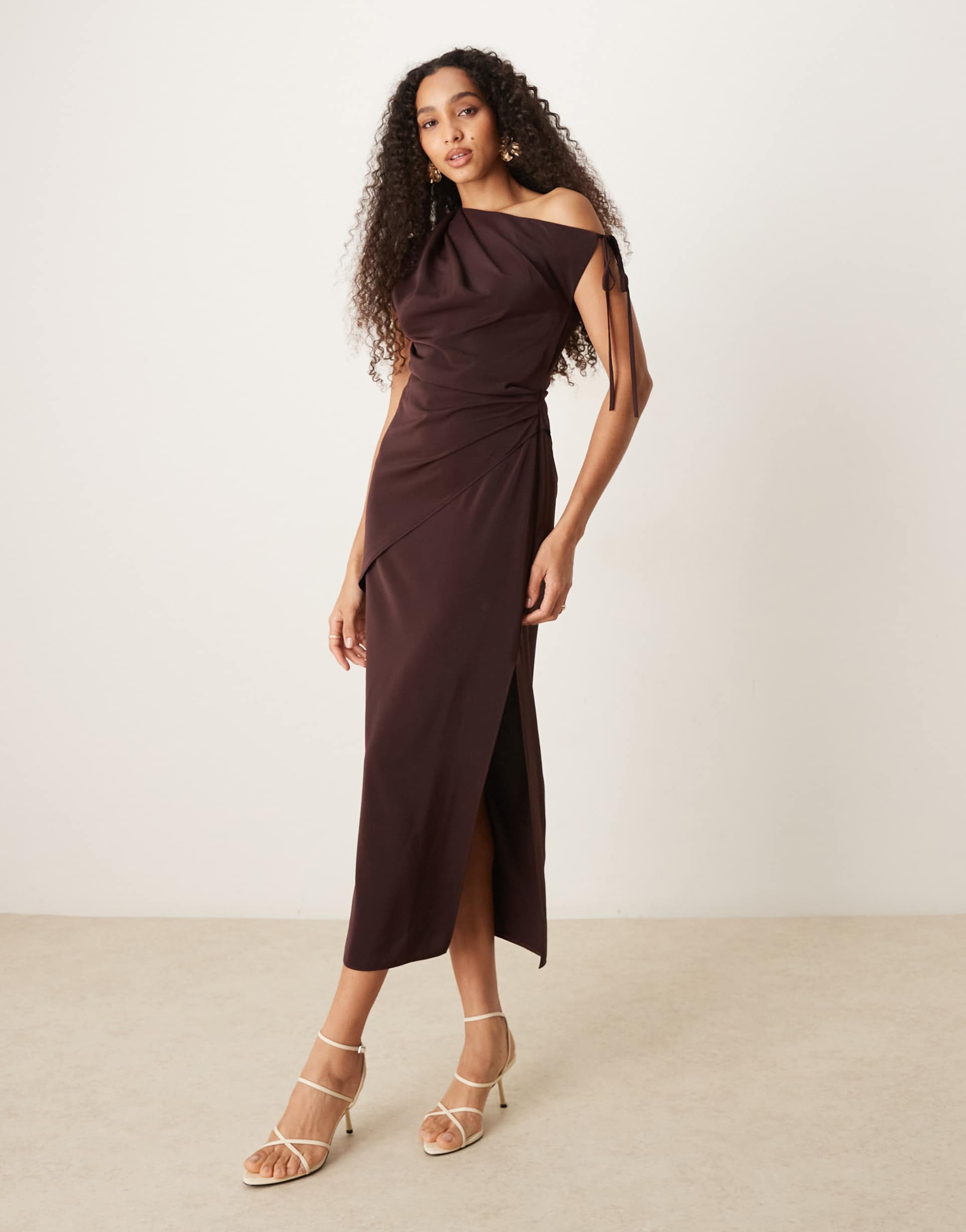 Super-smooth slinky polyester fabric shapes a figure-flattering sheath silhouette in a rich matte brown hue. This elegant midi dress features a modern one-shoulder strap with a delicate tie detail and flattering ruching across the bodice. The clean hem and side slit add movement and allure, perfect for date nights, cocktail parties, or stylish evenings out. Its regular fit balances comfort with sophistication, making it a versatile wardrobe staple for all-weather wear.