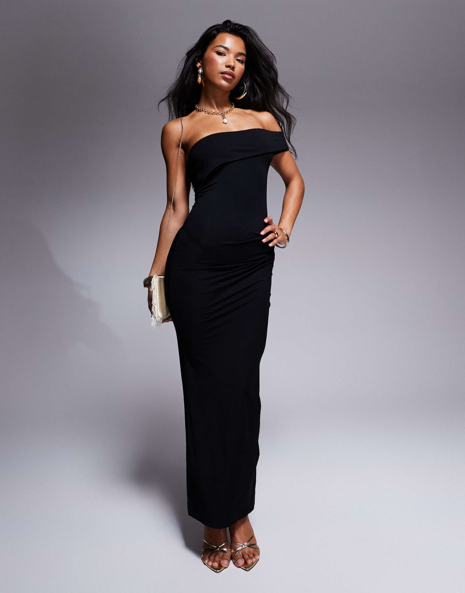 ASOS DESIGN FAUX BARDOT MIDI DRESS WITH DRAPED PENCIL SKIRT IN BLACK