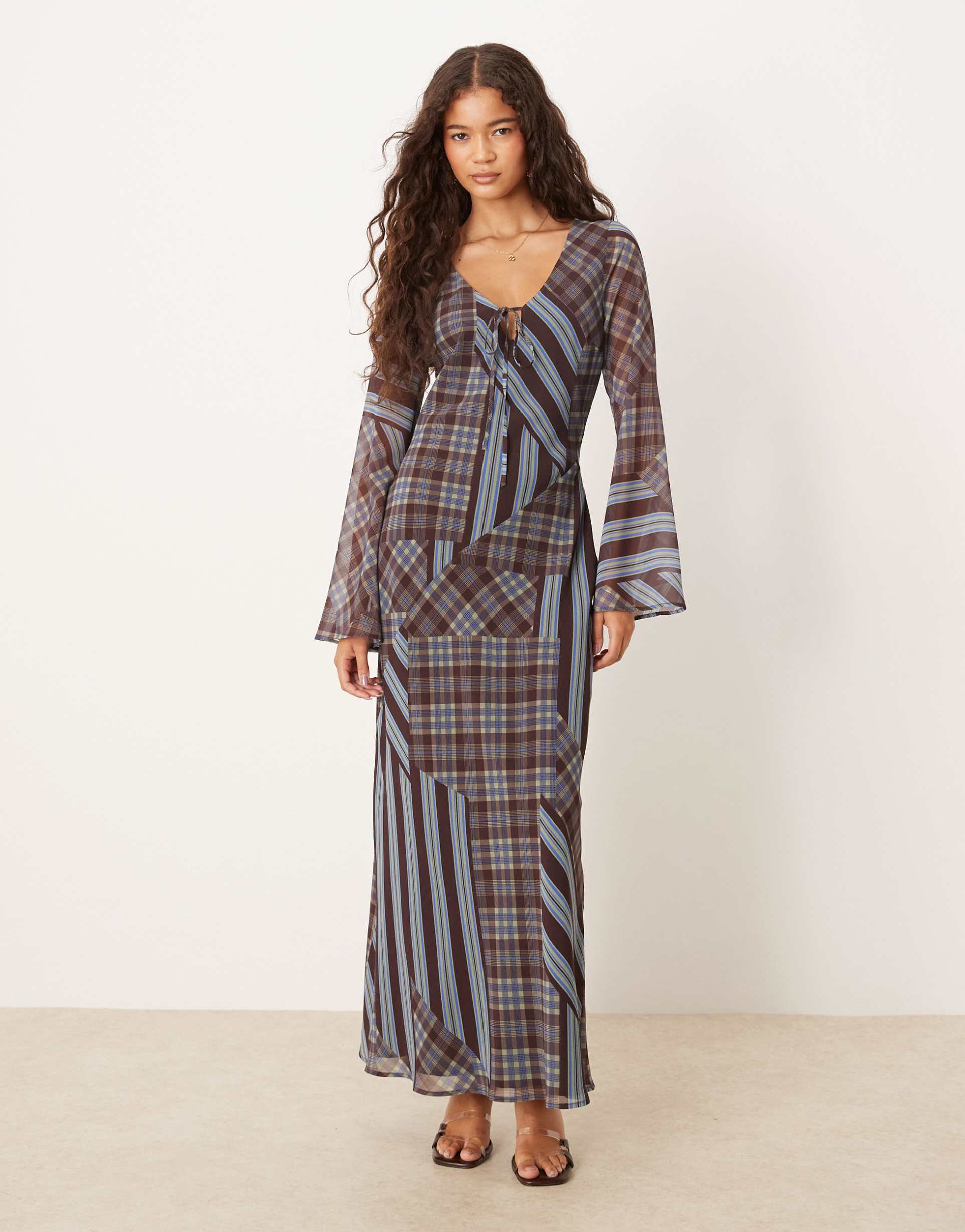 ASOS DESIGN FLARED SLEEVE V NECK MAXI DRESS IN PLAID