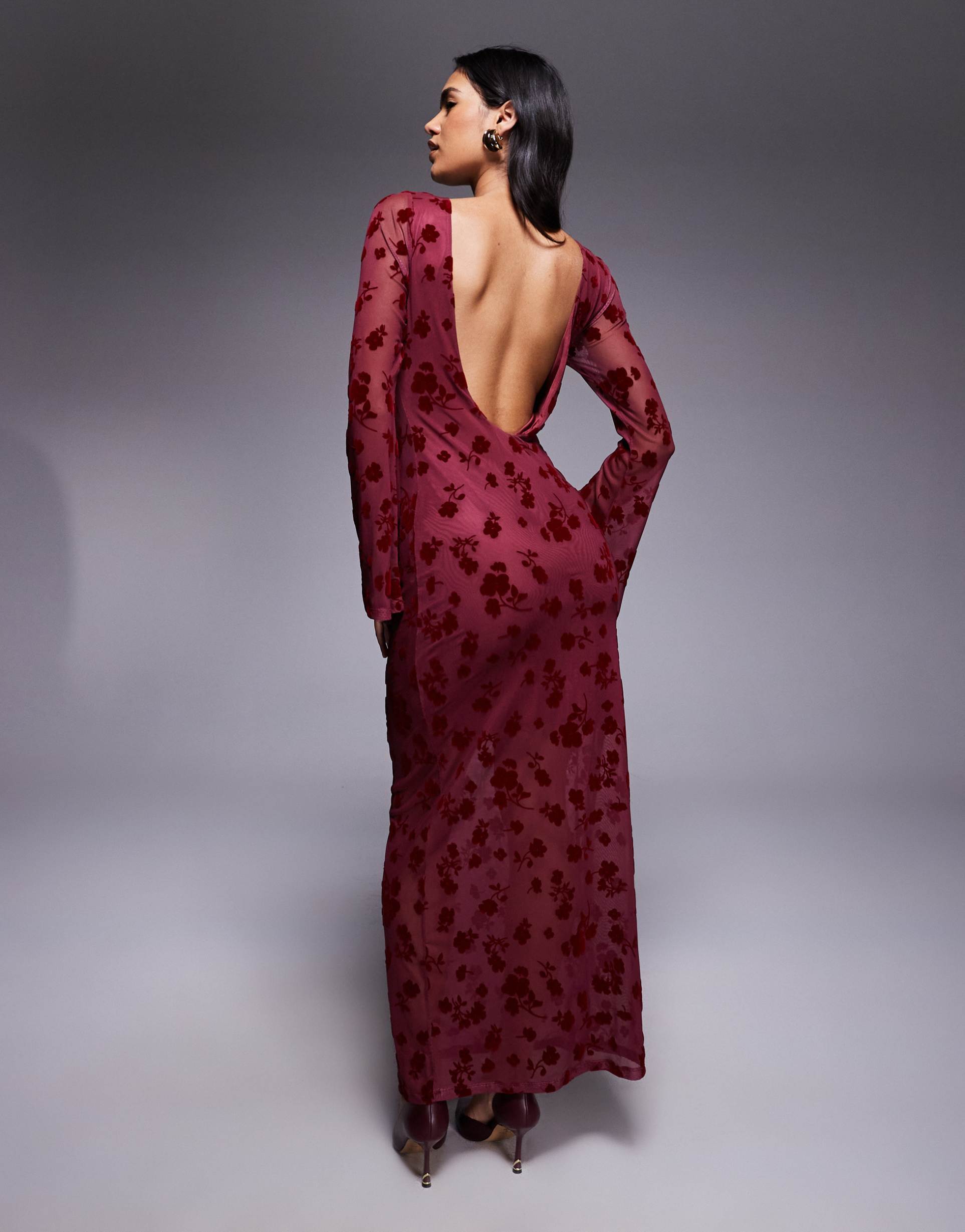 A soft and stretchy cotton-jersey maxi dress in a deep burgundy hue features an elegant column silhouette and a regular fit for comfortable wear. The long sleeves with subtle flute detailing and a classic round neckline create a sophisticated look, while the open back adds a striking, modern twist. Ideal for autumn and winter evenings, this floral flock dress is perfect for cocktail parties, date nights, or night outs, blending timeless elegance with contemporary style.