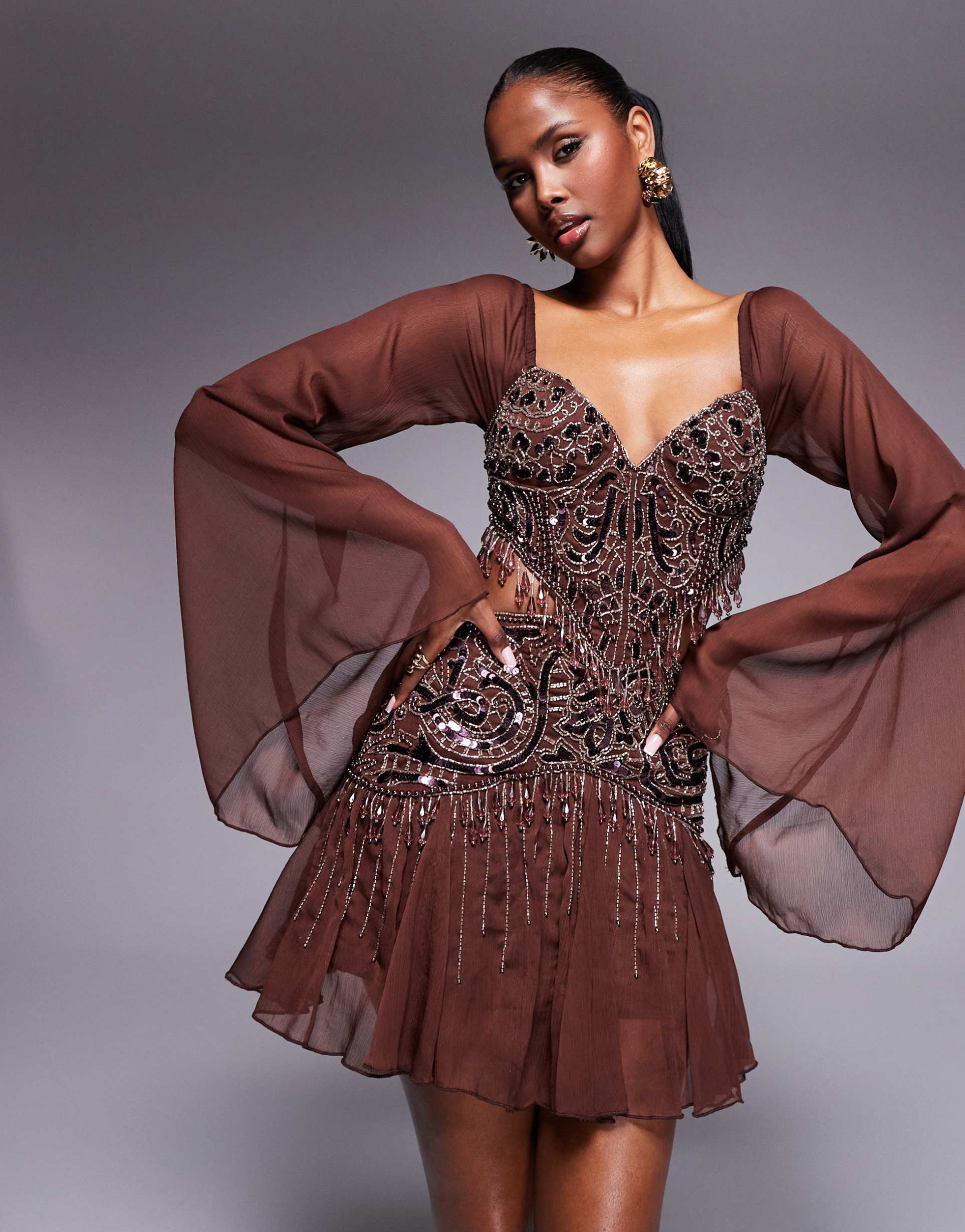 ASOS DESIGN FLUTED SLEEVE MINI DRESS WITH PLACEMENT EMBELLISHMENT IN CHOCOLATE