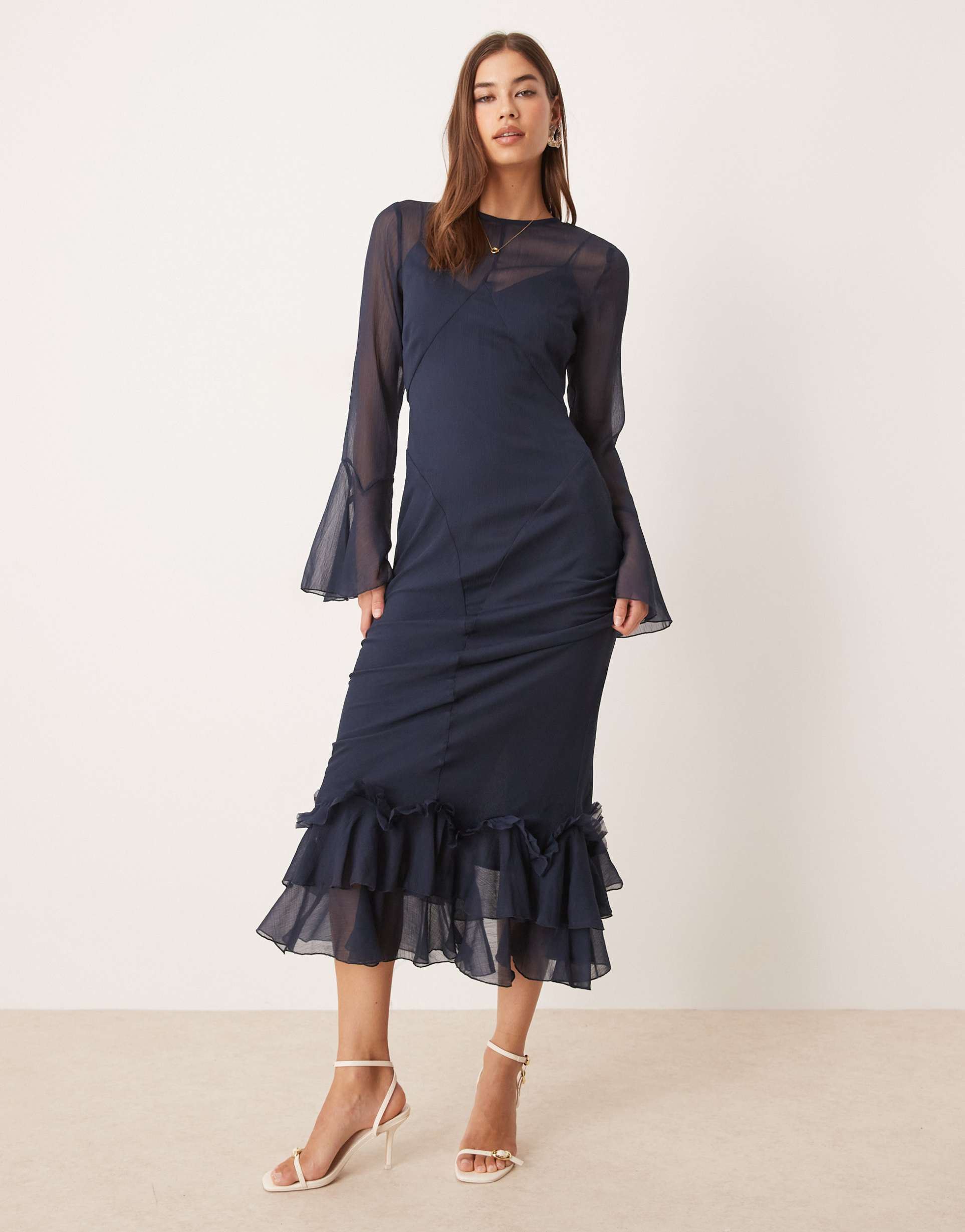ASOS DESIGN FLUTTER SLEEVE MAXI DRESS WITH FRILL HEM IN NAVY