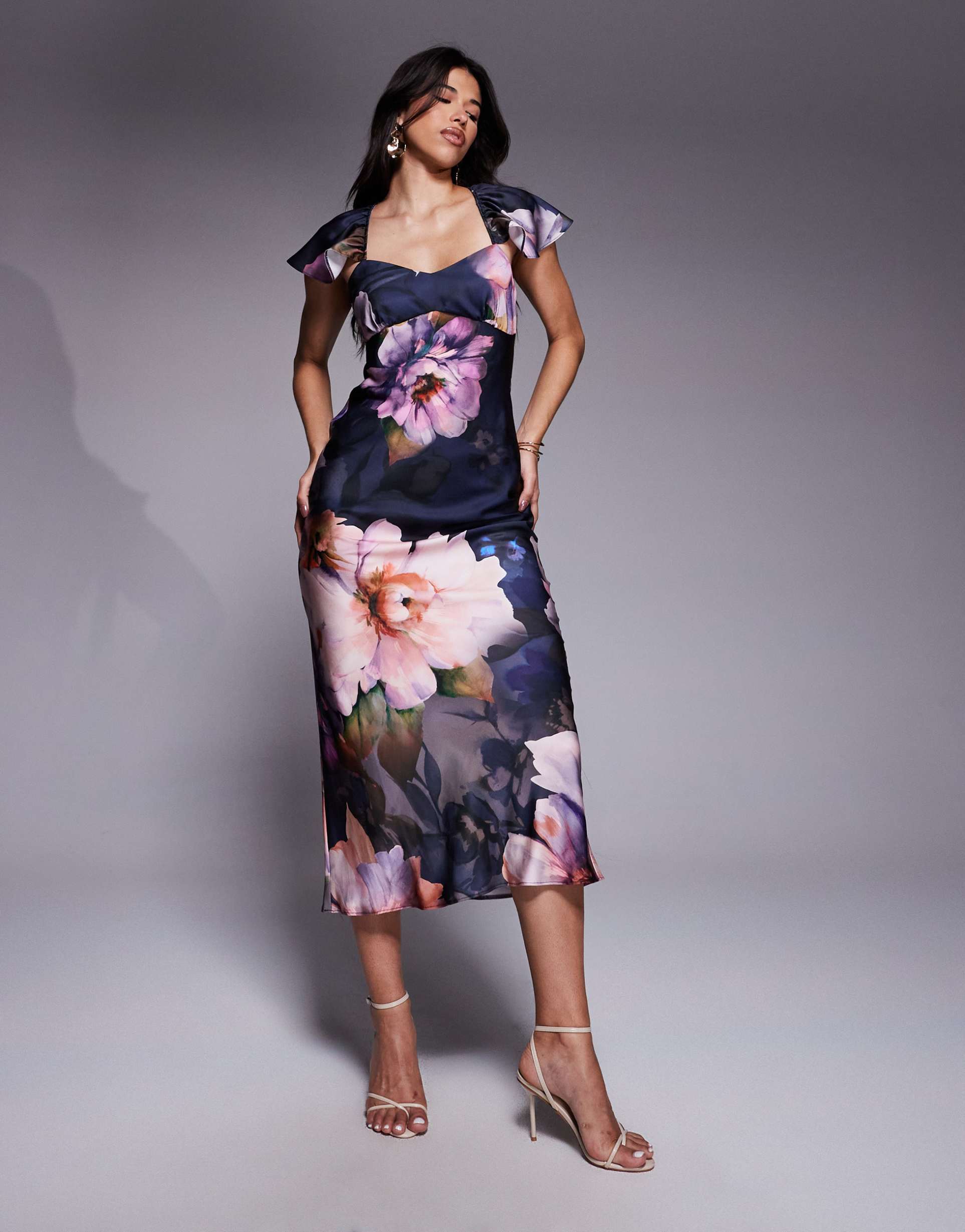 ASOS DESIGN FLUTTER SLEEVE SATIN MIDI DRESS IN PURPLE OCCASION FLORAL PRINT