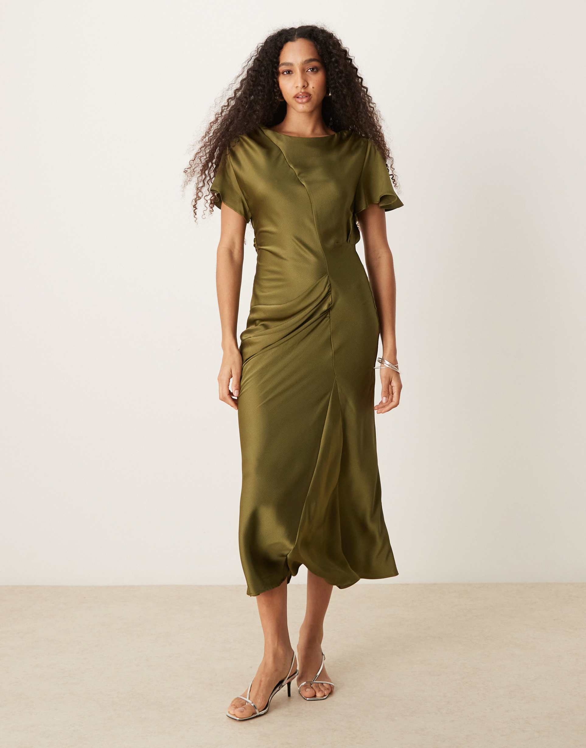 ASOS DESIGN FLUTTER SLEEVES SATIN MAXI DRESS IN OLIVE