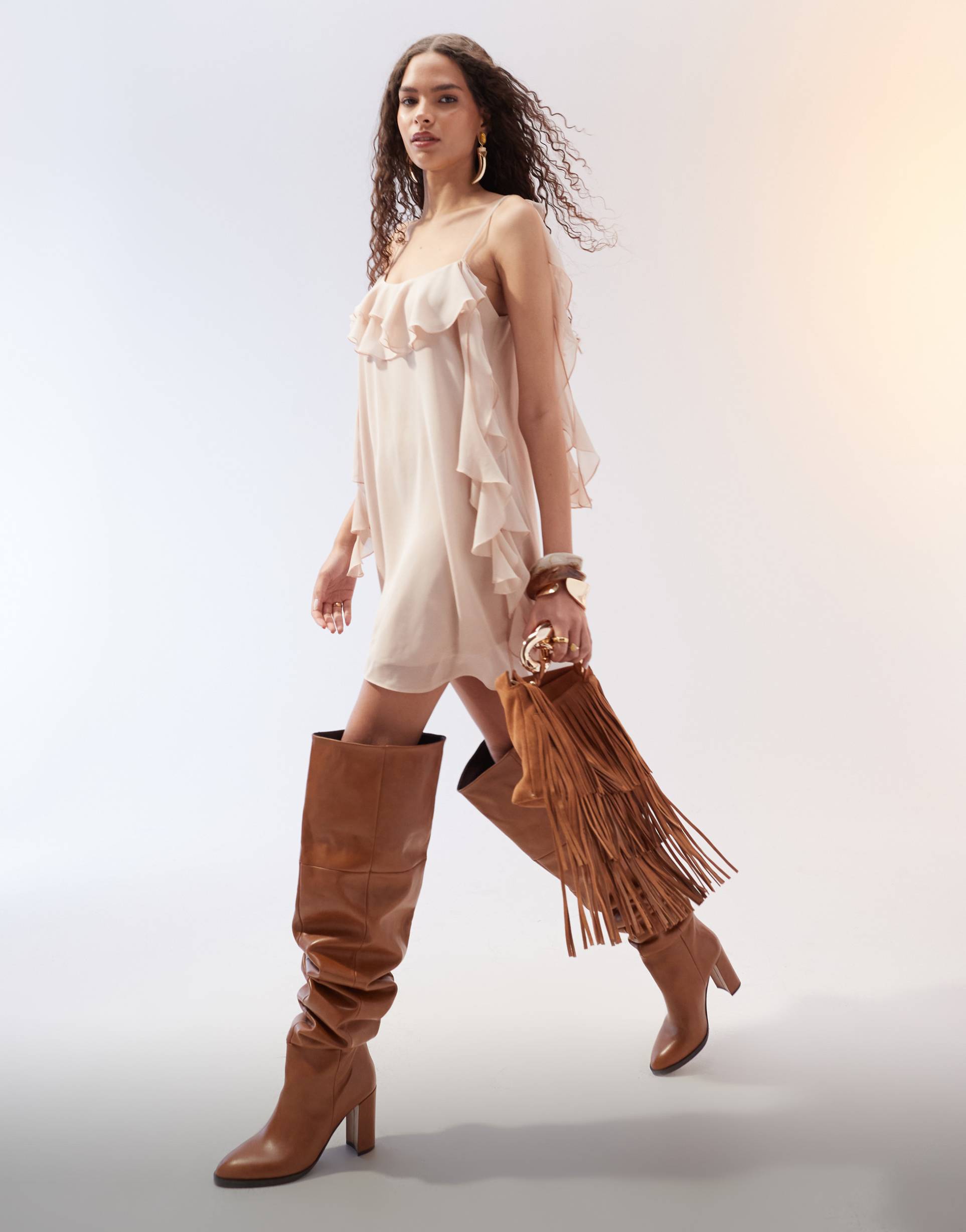 ASOS DESIGN FRILLY CAMI CHIFFON MINI DRESS WITH OPEN BACK DETAIL IN NATURAL PALE PINK