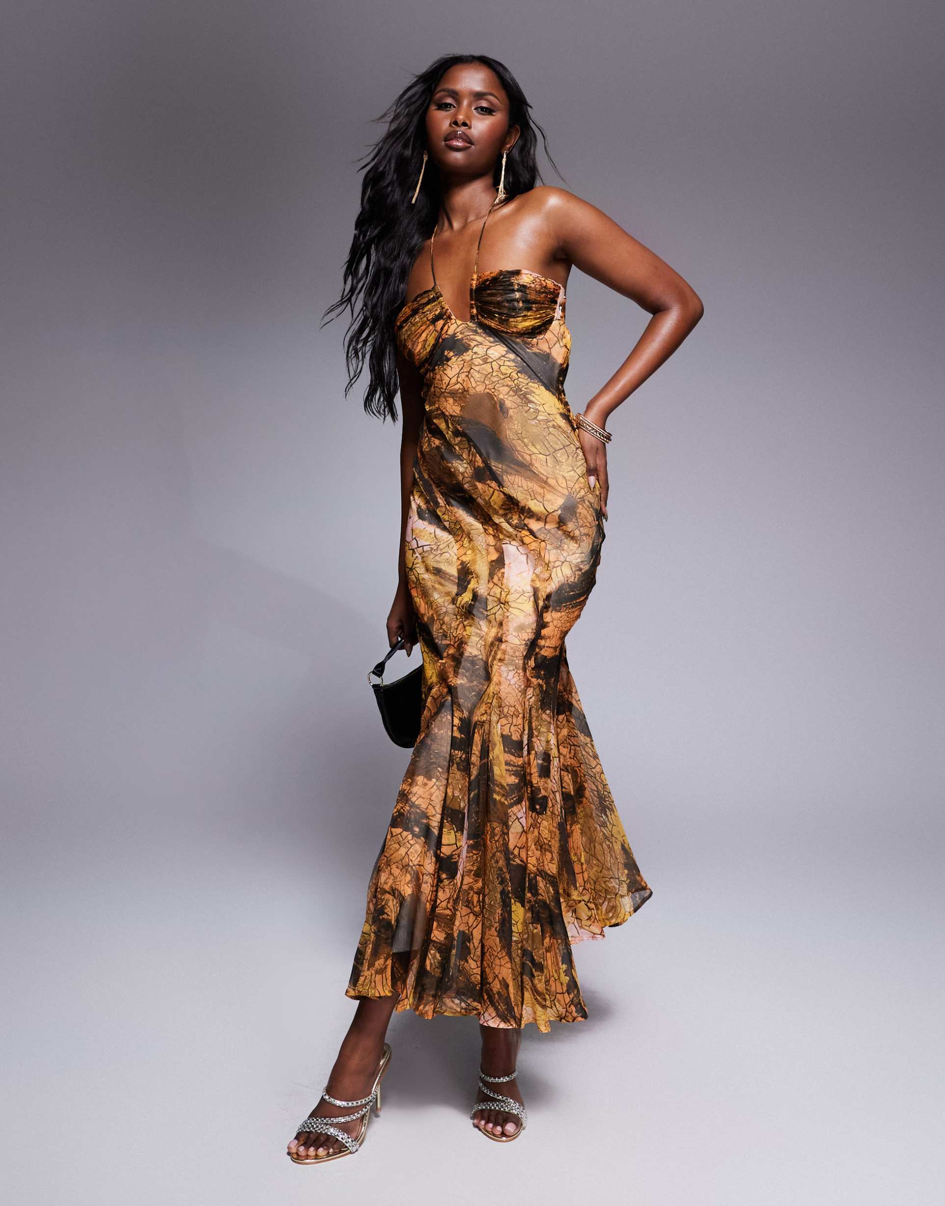 ASOS DESIGN HALTER ASYMMETRIC RAW EDGE MAXI DRESS IN ABSTRACT PRINT