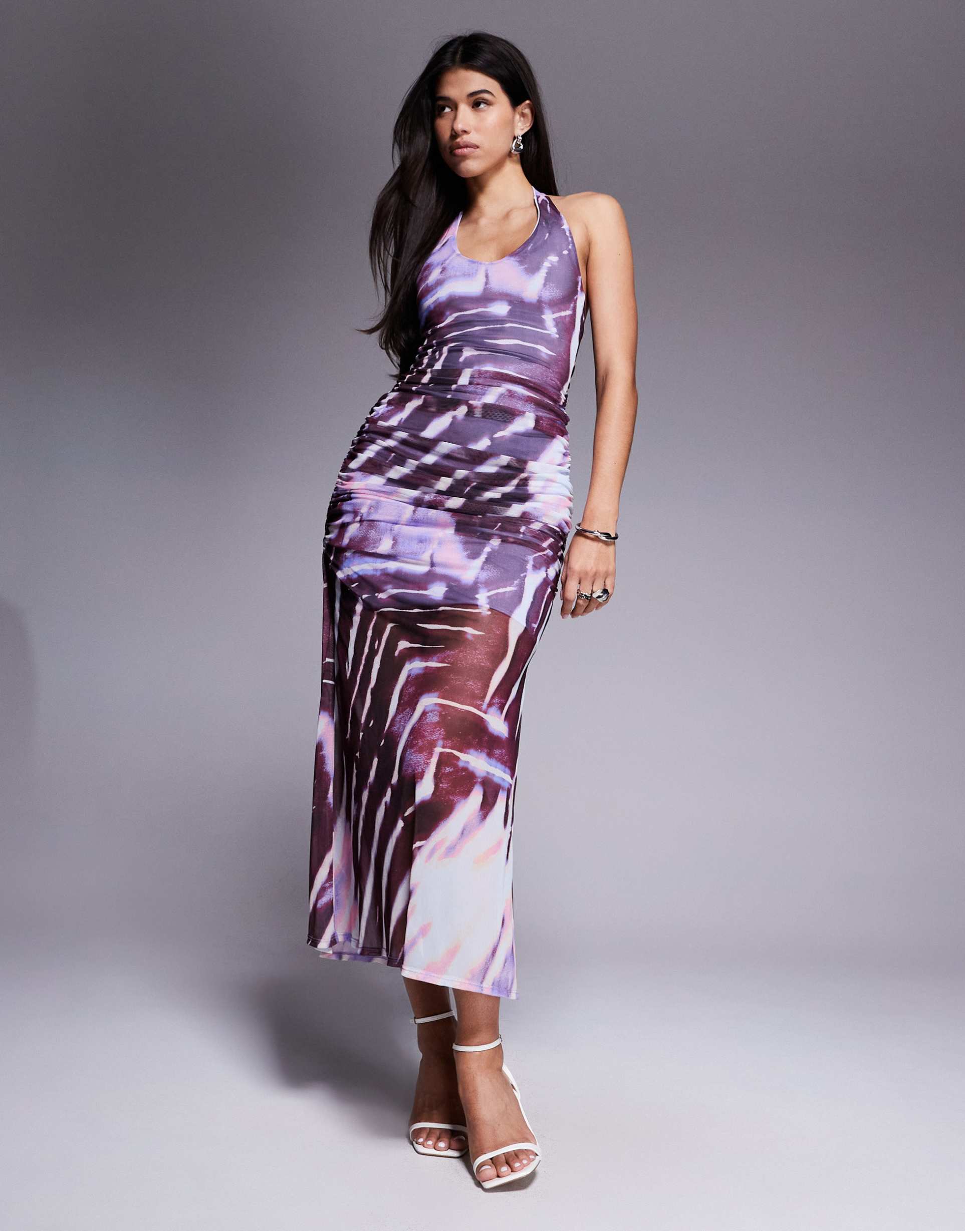 Soft, stretchy mesh fabric and a halter neck create a sleek and sexy maxi slip dress adorned with an abstract zebra print. The ruched sides add subtle texture and contouring, enhancing the regular fit silhouette. Perfect for warm spring and summer nights, this versatile dress transitions effortlessly from cocktail parties to date nights and lively evenings out. The combination of purple, black, and white matte hues in a bold animal pattern makes a confident style statement while the clean hemline maintains a modern edge.