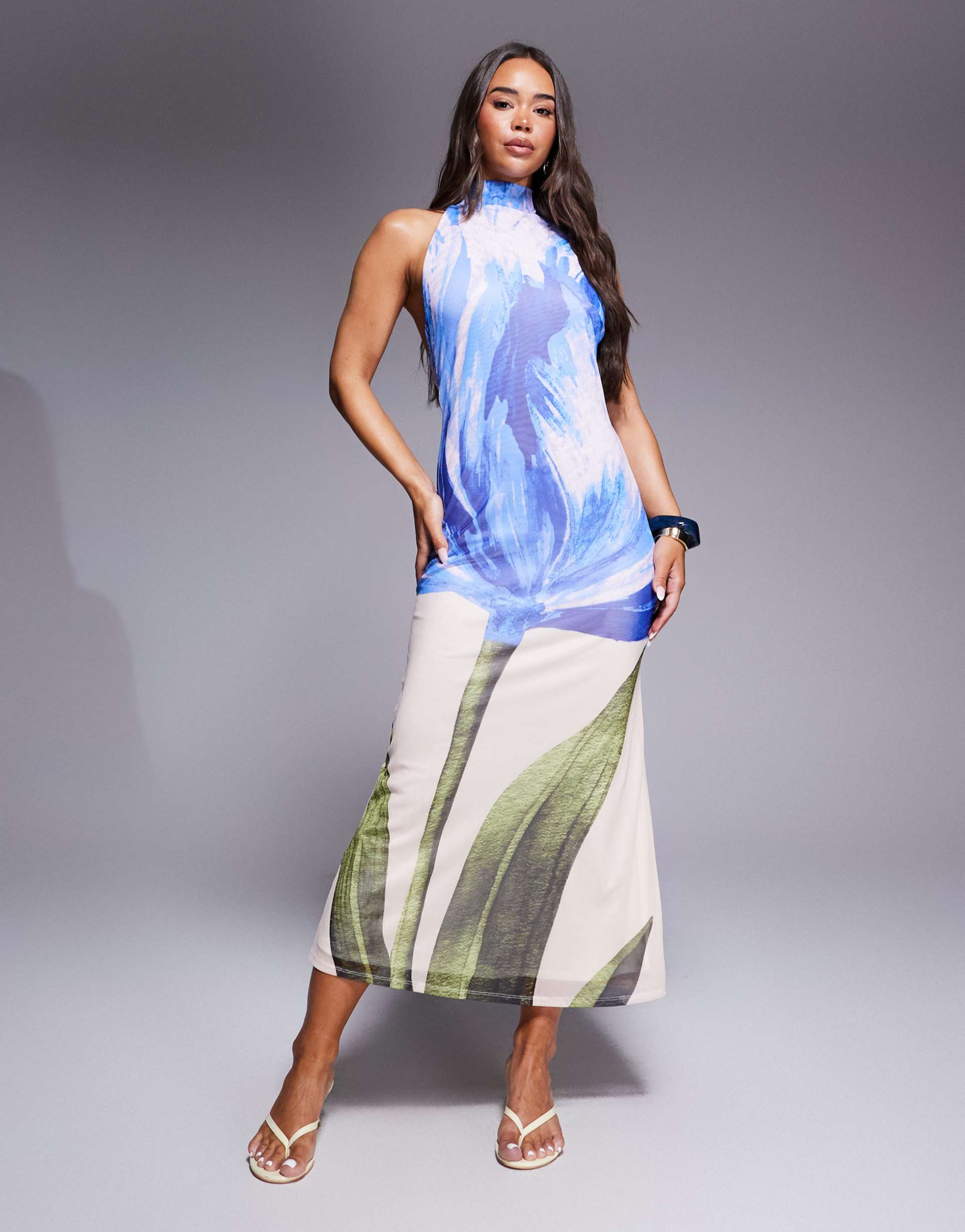 Soft polyester blend fabric with a slim fit silhouette defines this elegant slip dress featuring a halter neck and open back adorned with drape details. The maxi length and sleeveless styling enhance its modern appeal, while the all-over blue and green floral print adds a fresh, summery vibe. Perfect for date nights, cocktail events, or evenings out, this dress combines comfort with style effortlessly. The tie-up closure at the back allows for an adjustable fit, making it a versatile choice for warm weather occasions.
