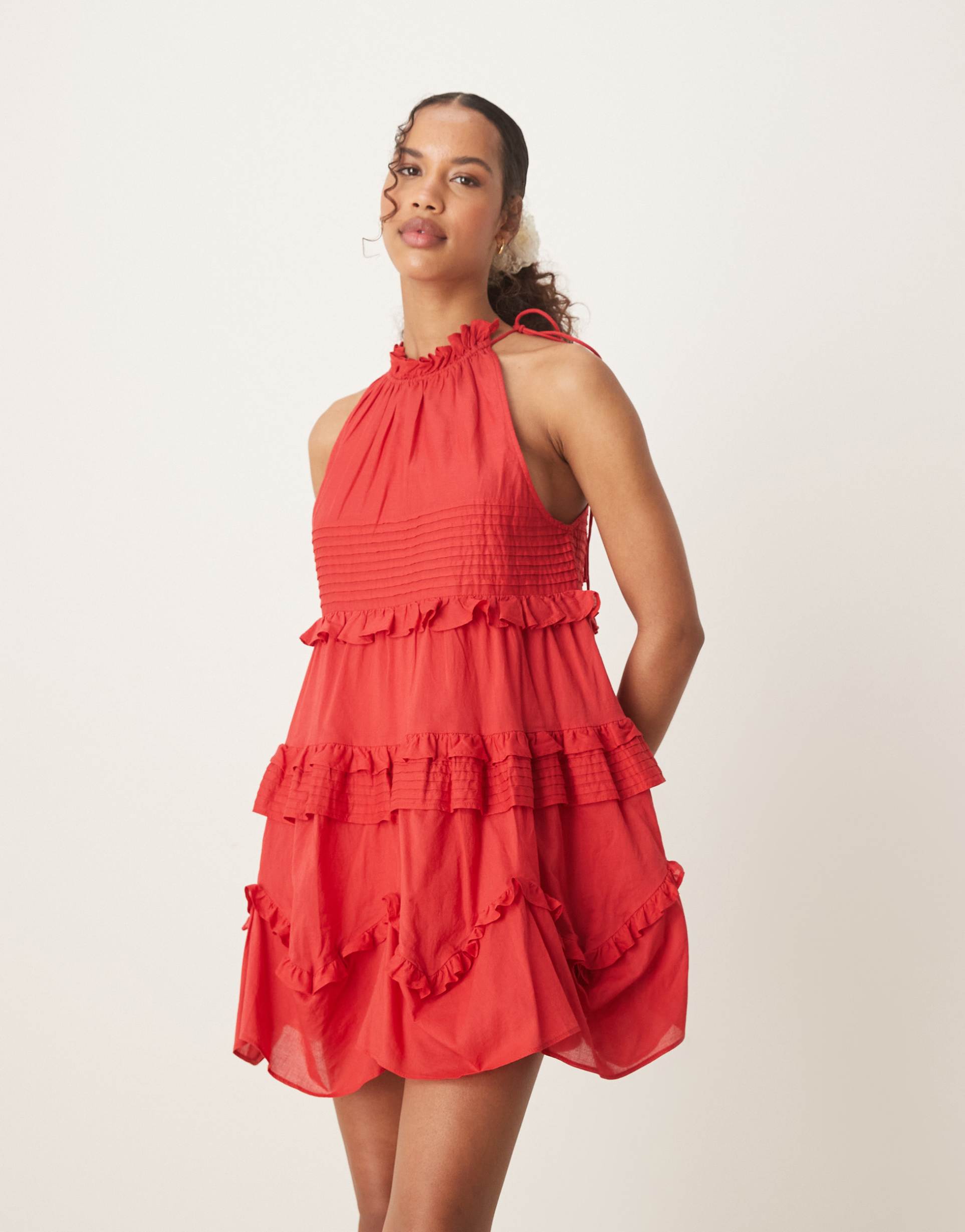 ASOS DESIGN HALTER RUFFLE MINI DRESS WITH PINTUCKS IN DEEP RED