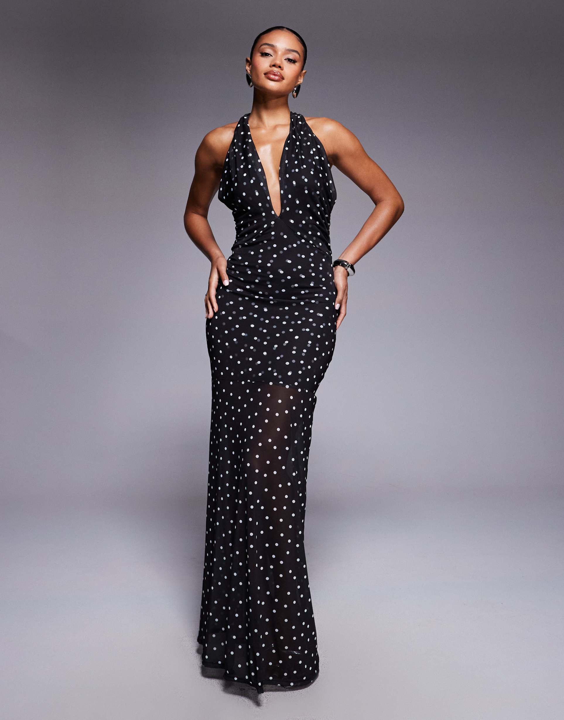 ASOS DESIGN HALTERNECK DETAIL MESH MAXI DRESS WITH SHEER SKIRT IN POLKA DOT PRINT