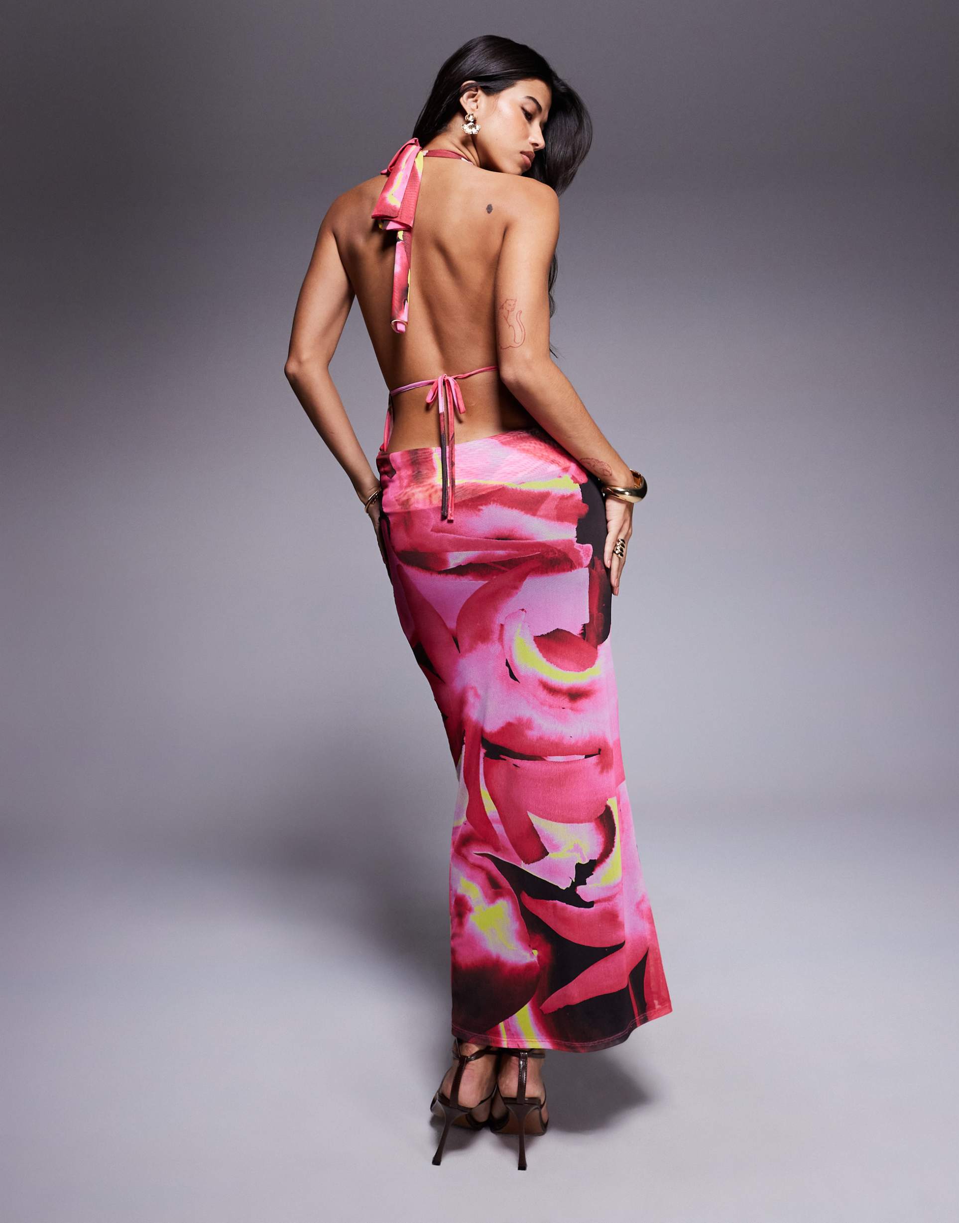 Soft, stretchy jersey fabric shapes a slim-fitting slip dress that features a sophisticated cowl neckline and an alluring open back with tie-up fastening. The midi length and strapless silhouette highlight the abstract pink swirl print, blending shades of pink, black, white, and red for a bold statement. Ideal for summer nights, this dress suits date nights, cocktail events, and stylish night outs with its sexy and trendy vibe.