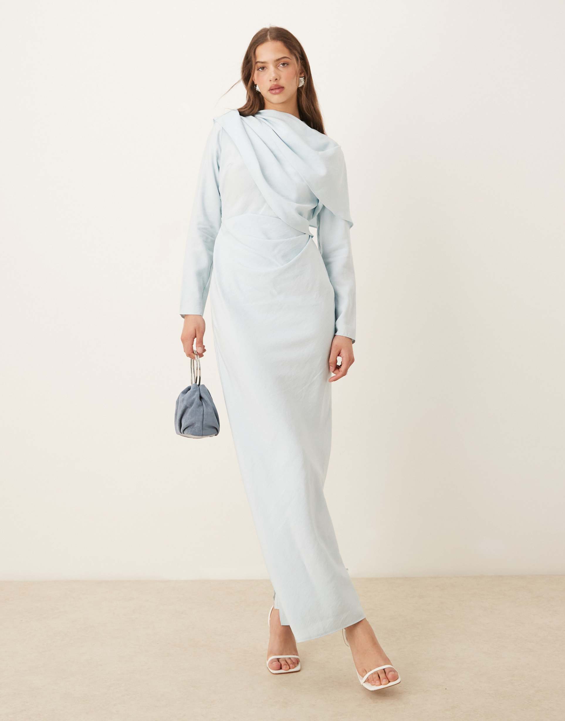ASOS DESIGN HIGH NECK DRAPED BODICE MAXI DRESS IN LIGHT BLUE
