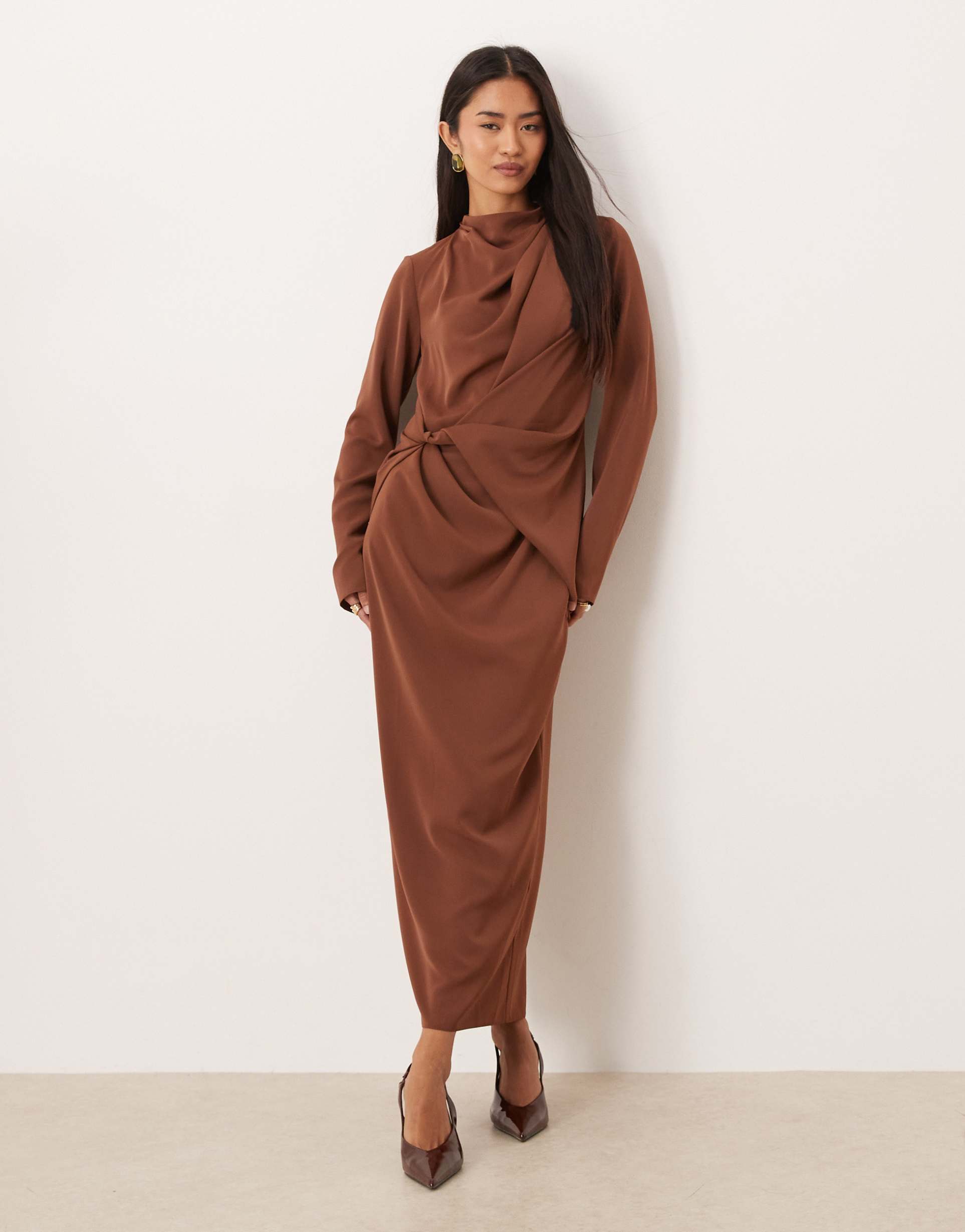 ASOS DESIGN HIGH NECK DRAPED SLINKY MAXI DRESS IN CHOCOLATE