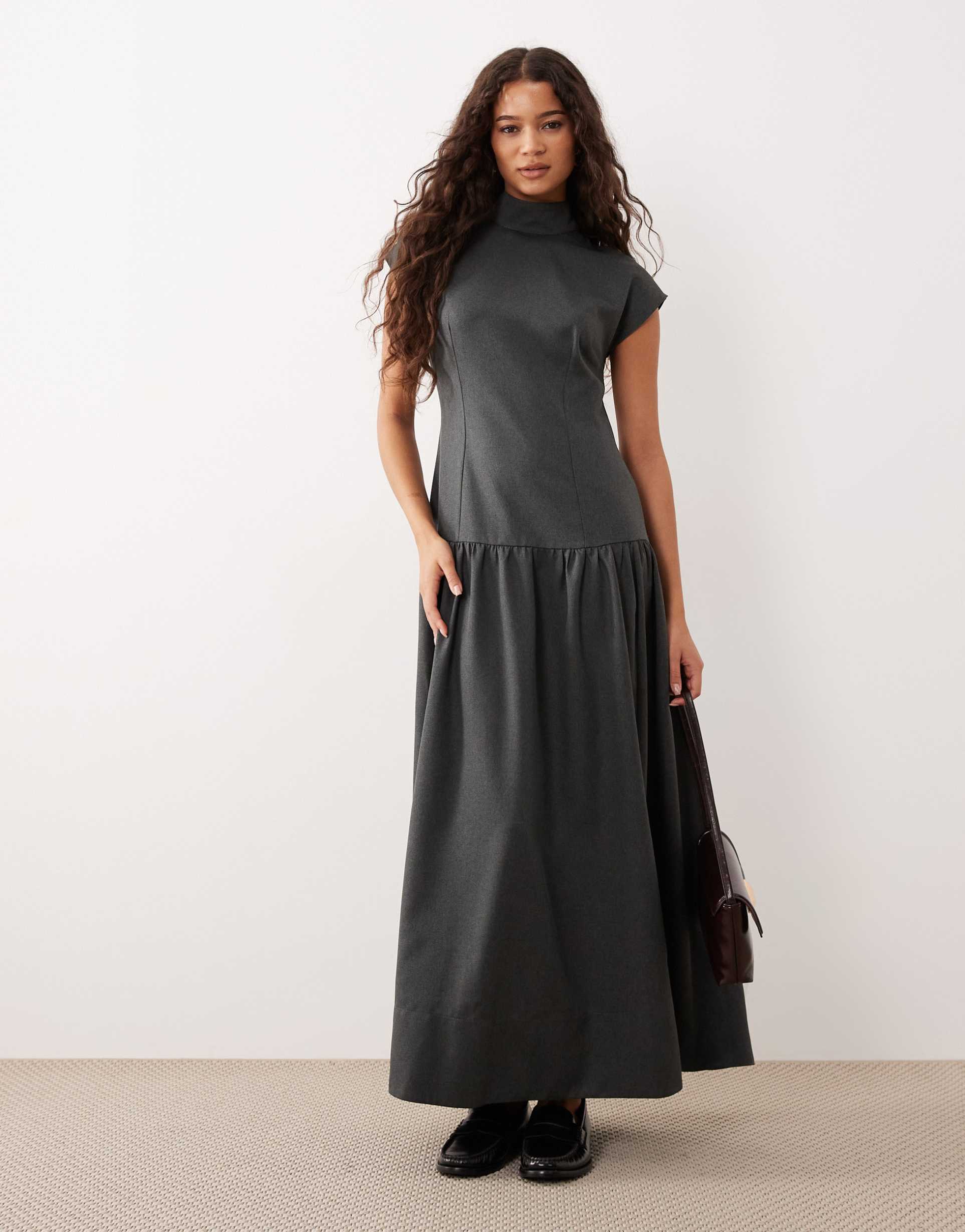 ASOS DESIGN HIGH NECK DROP WAIST MAXI DRESS IN GRAY