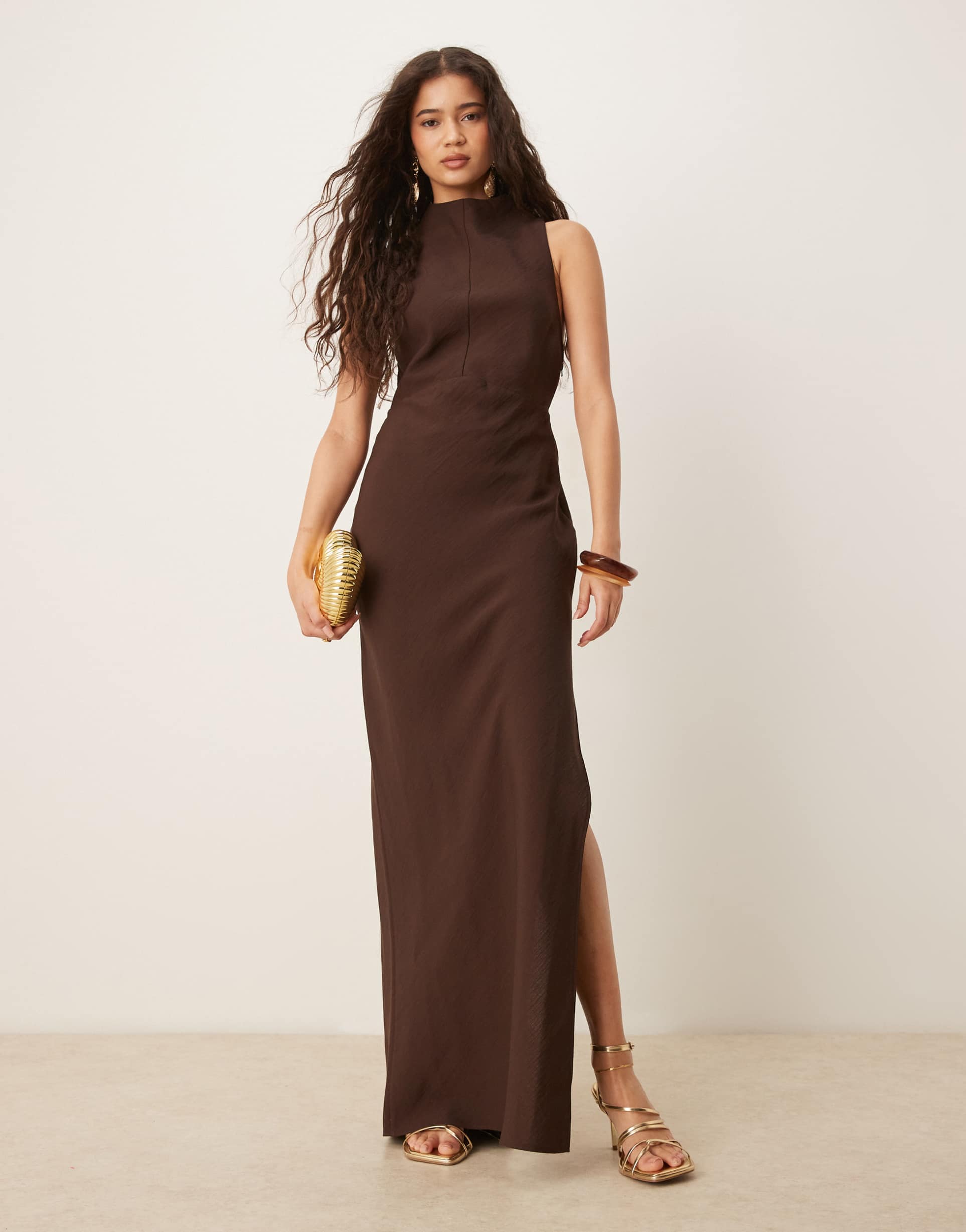 A sleek column silhouette in a rich matte brown hue offers a timeless elegance with a high neckline and sleeveless cut. Crafted from a viscose-polyester blend, this maxi dress features a side slit for graceful movement and subtle hardware trim at the back that adds a modern edge. Its regular fit and clean hemline make it an ideal choice for cocktail parties, formal events, or date nights, blending minimalist sophistication with wearable comfort for all-weather appeal.