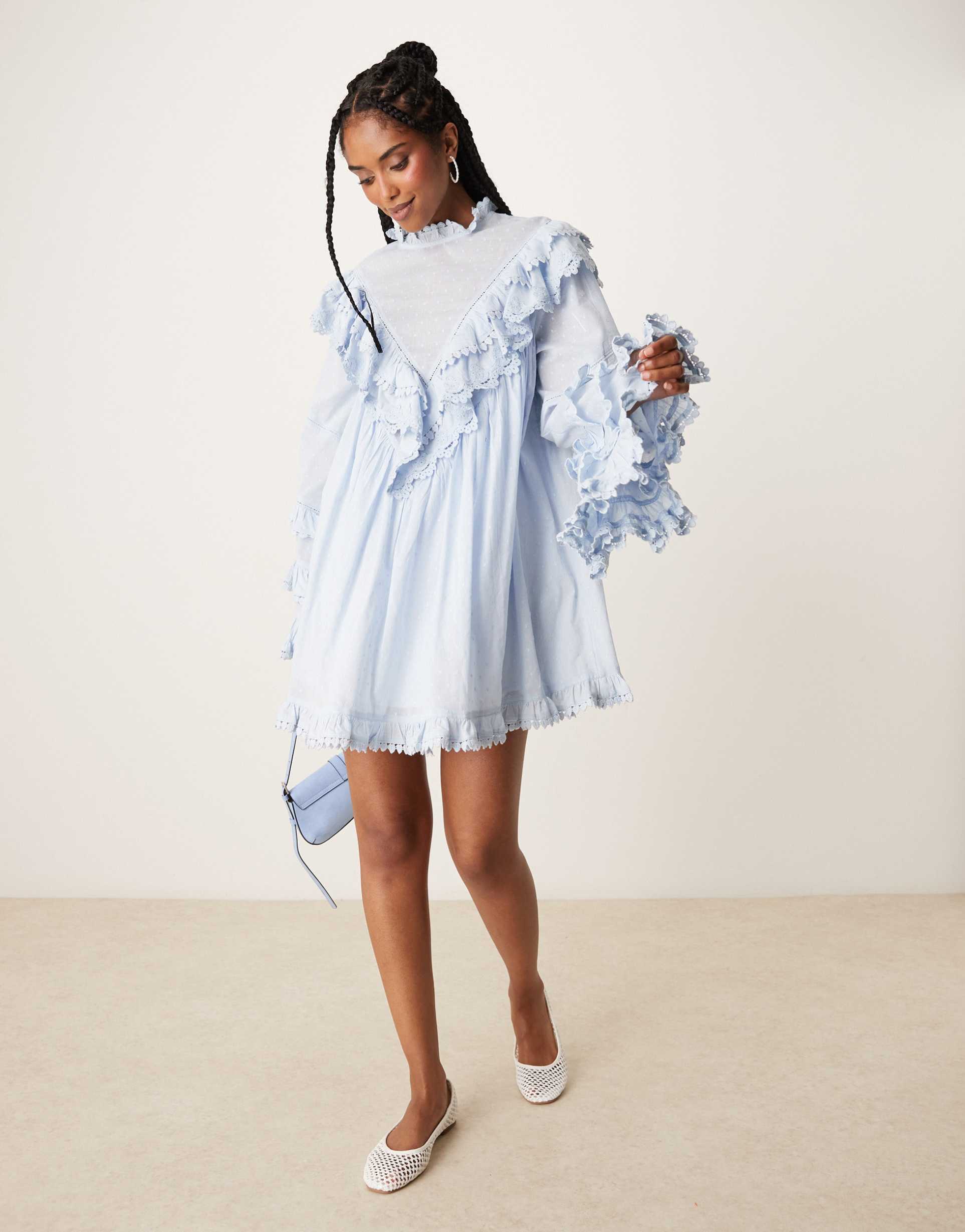 ASOS DESIGN HIGH NECK MINI DRESS WITH ANGLED FRILLS IN SOFT BLUE