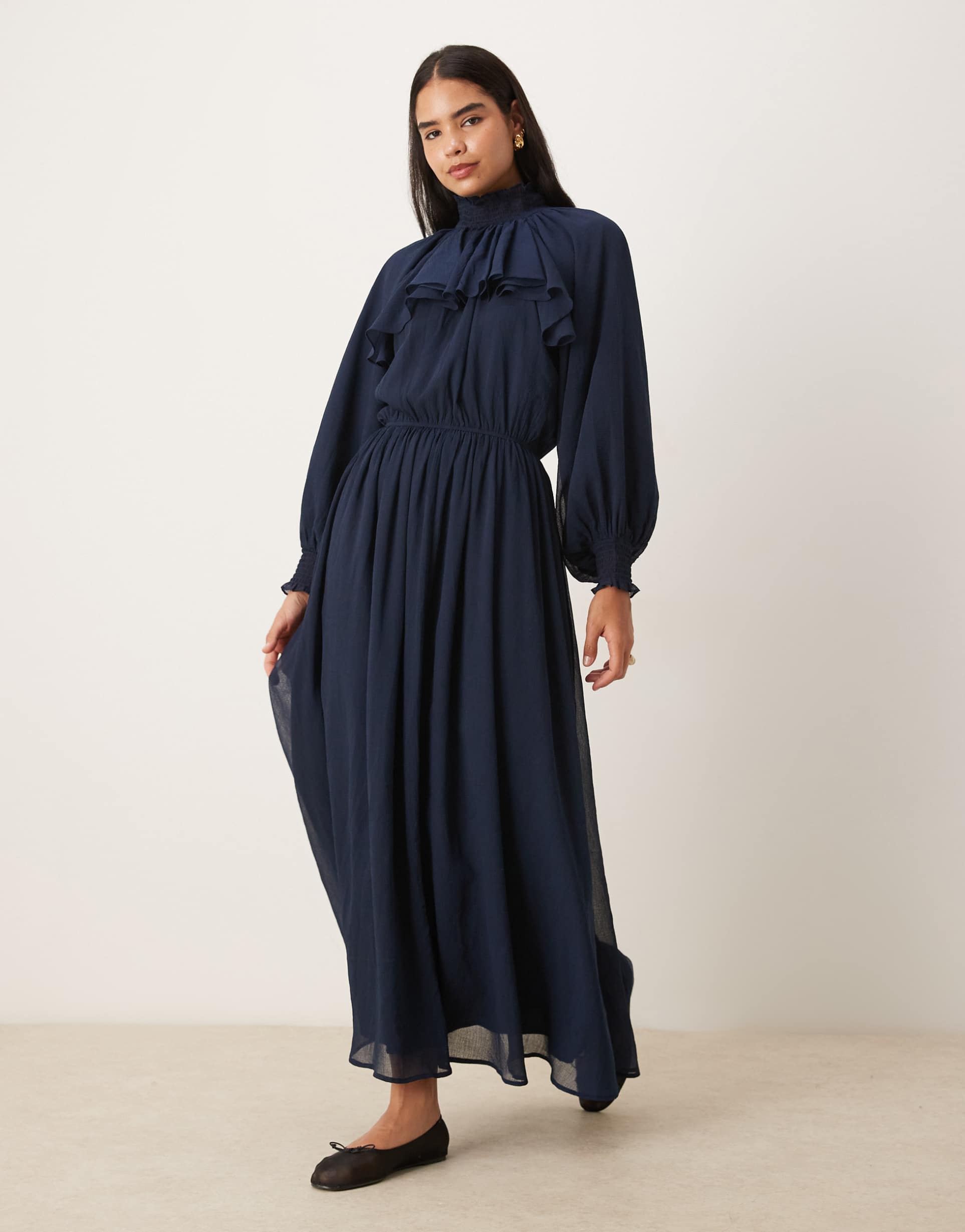 ASOS DESIGN HIGH NECK RUFFLE DETAILING CHIFFON MAXI DRESS IN NAVY