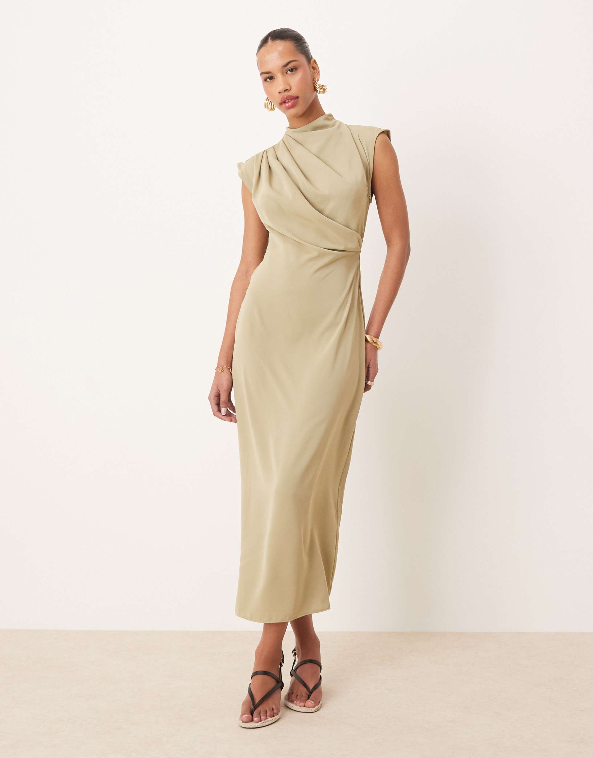 ASOS DESIGN HIGH NECK SLEEVELESS MIDI DRESS WITH DRAPED NECK IN SAGE GREEN
