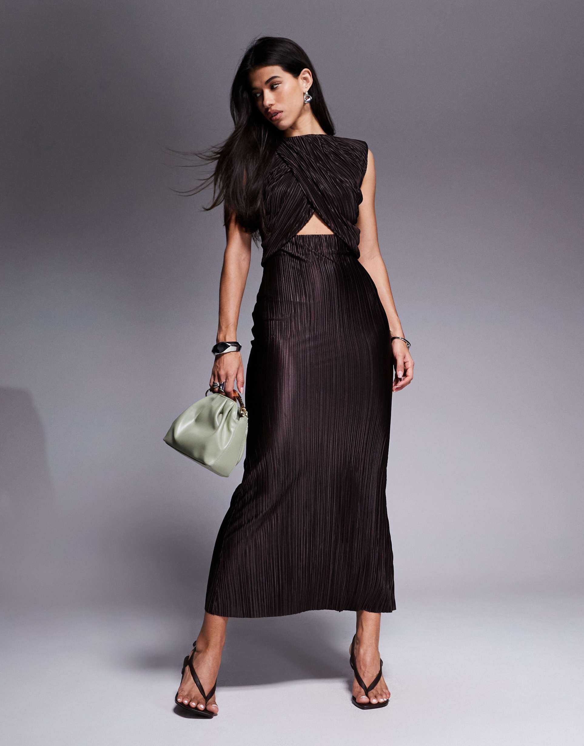 ASOS DESIGN HIGH NECK WITH CUT OUT WAIST DRAPE PLISSE MAXI DRESS IN CHOCOLATE