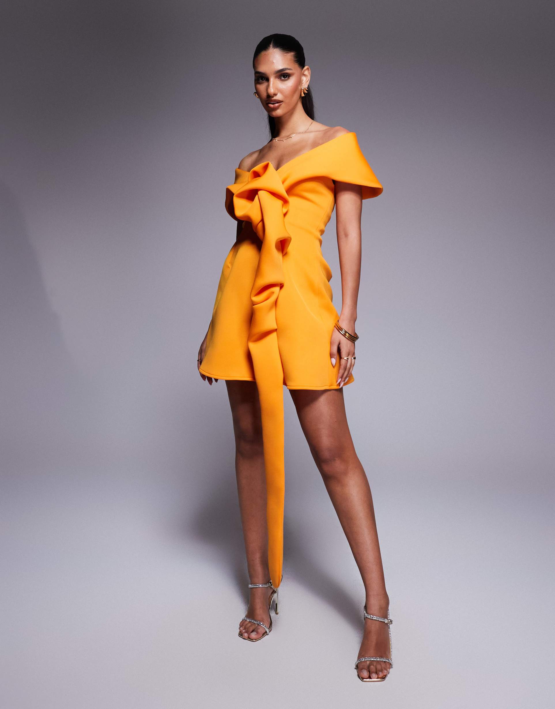 ASOS DESIGN JUST OFF THE SHOULDER SCUBA MINI DRESS WITH MANIPULATED FRONT DETAILING AND A-LINE SKIRT IN ORANGE