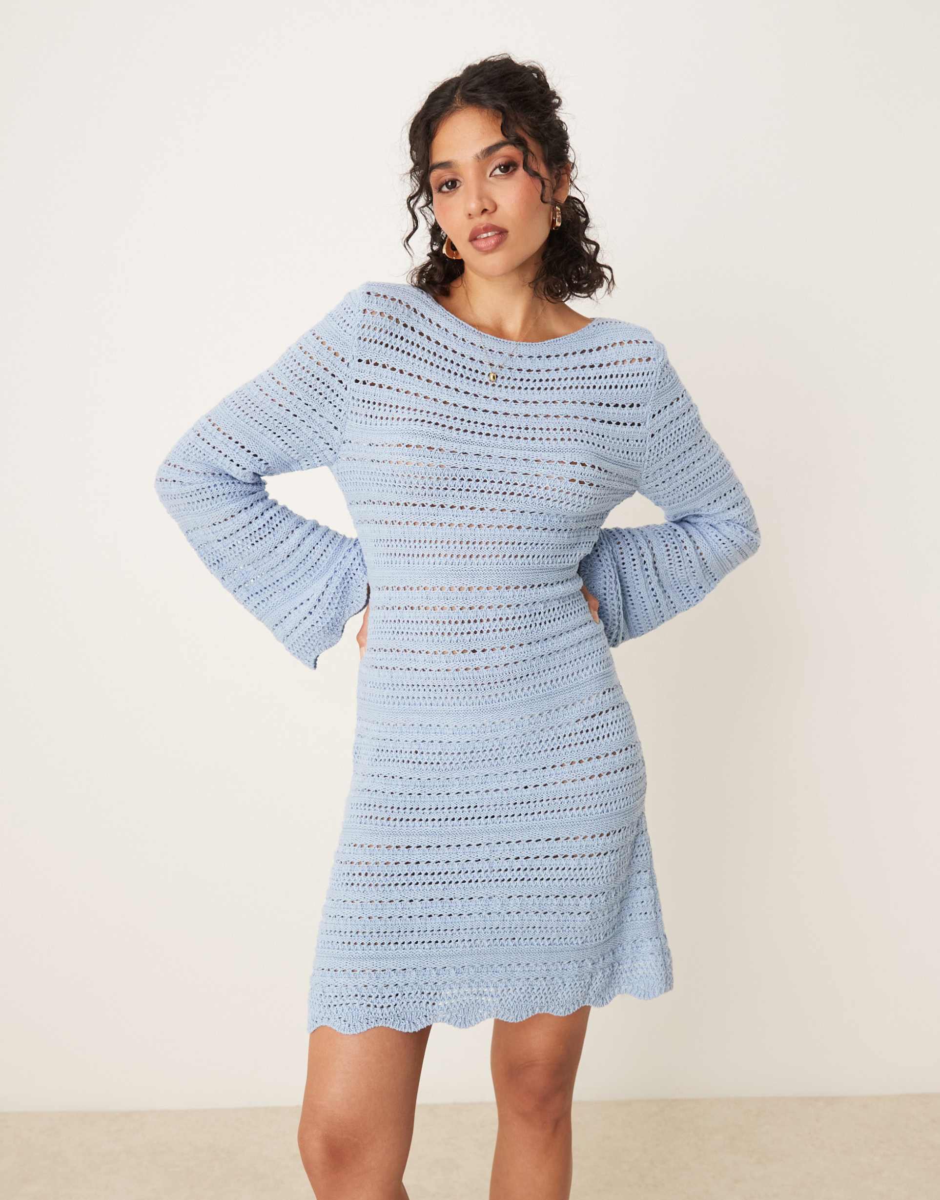 Soft light blue knit fabric with a loose-weave texture shapes this mini sweater dress featuring a boat neckline and dramatic flared long sleeves. The regular fit skims the body comfortably while scalloped trims along the hem and sleeves add delicate feminine details. Crafted from 100% cotton, this piece combines cozy warmth and breathable comfort, perfect for casual outings, brunch with friends, or everyday layering in transitional seasons. Its minimalist silhouette blends relaxed charm with subtle design accents for versatile styling.
